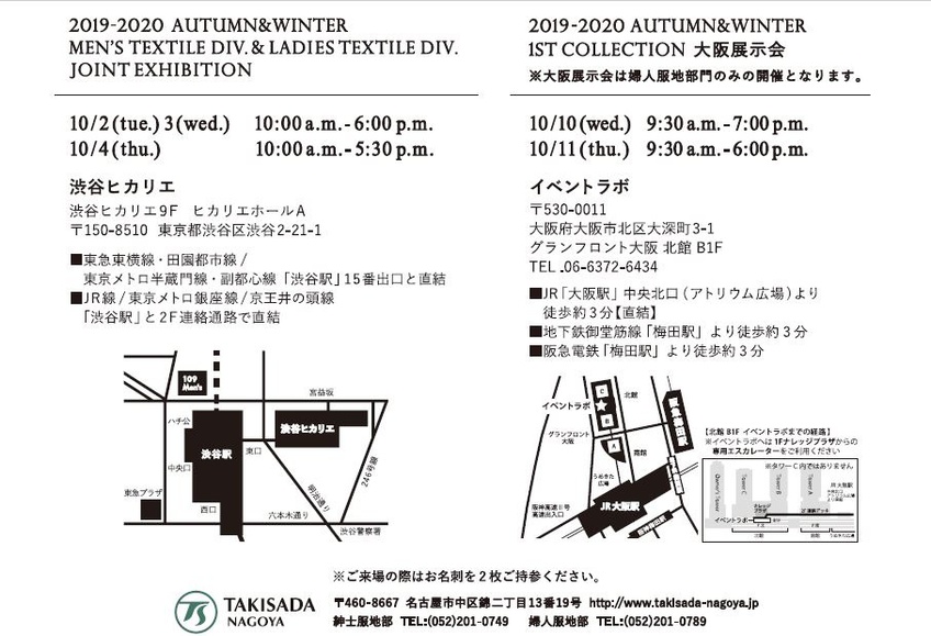 201809/19 展会通知 19-20 AUTUMN & WINTER 1st COLLECTION 2019-2020AW 1st联展通知。本次展会由女士/男士服装面料部门联合举办。 "☆东京:10/2(tue) 10/3(wed) 10:00-18:00 10/4-(thu) 10:00-17:30 会场:涩谷Hikarie 9F Hikarie大厅A" "☆大阪:10/10(wed) 9:30-19:00 10/11(thu.) 9:30-18:00 会场:GRAND FRONT大阪 北馆B1F EVENT Lab. ※大阪展会仅由女士服装面料部门举办。" 务请光临!!
