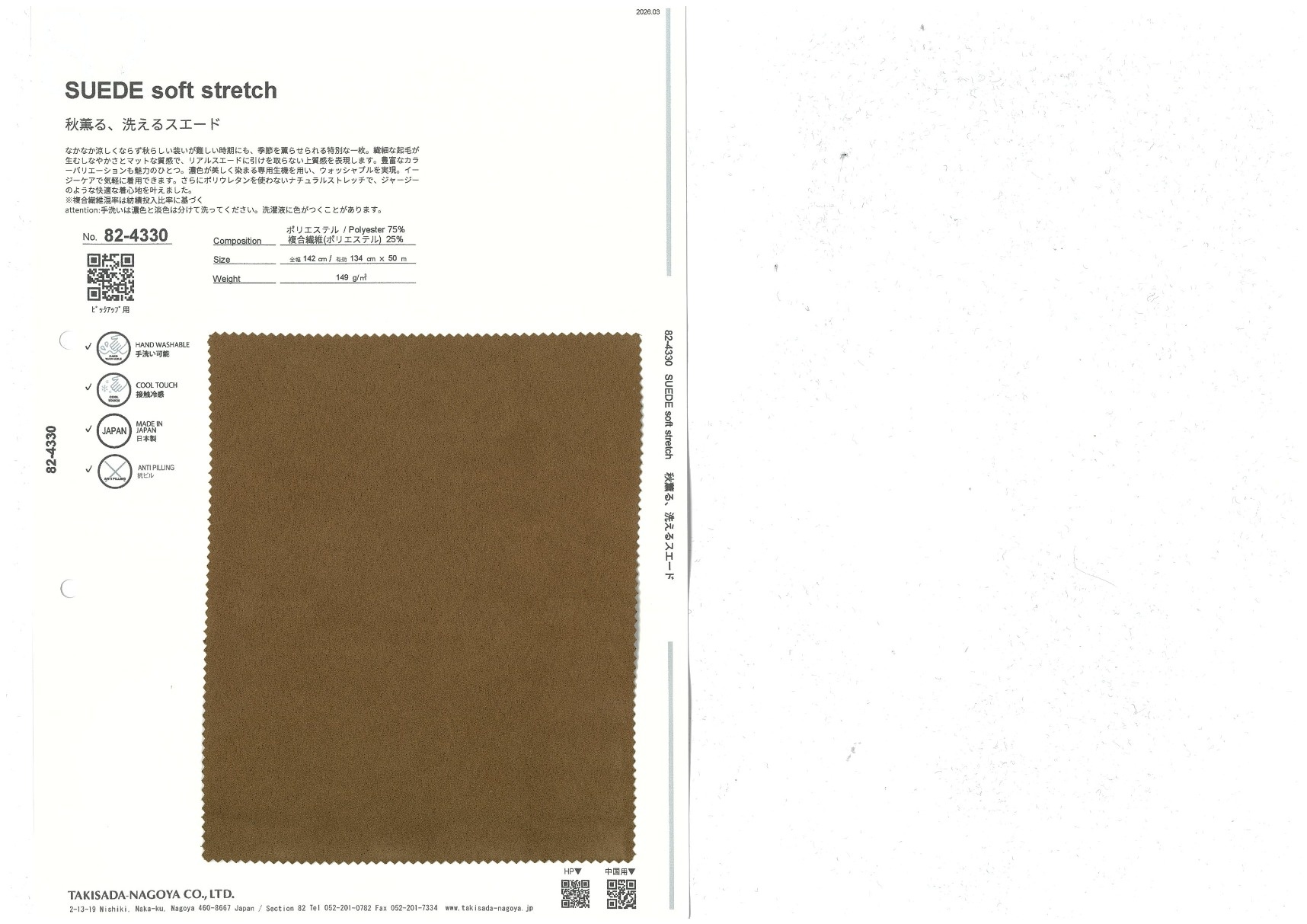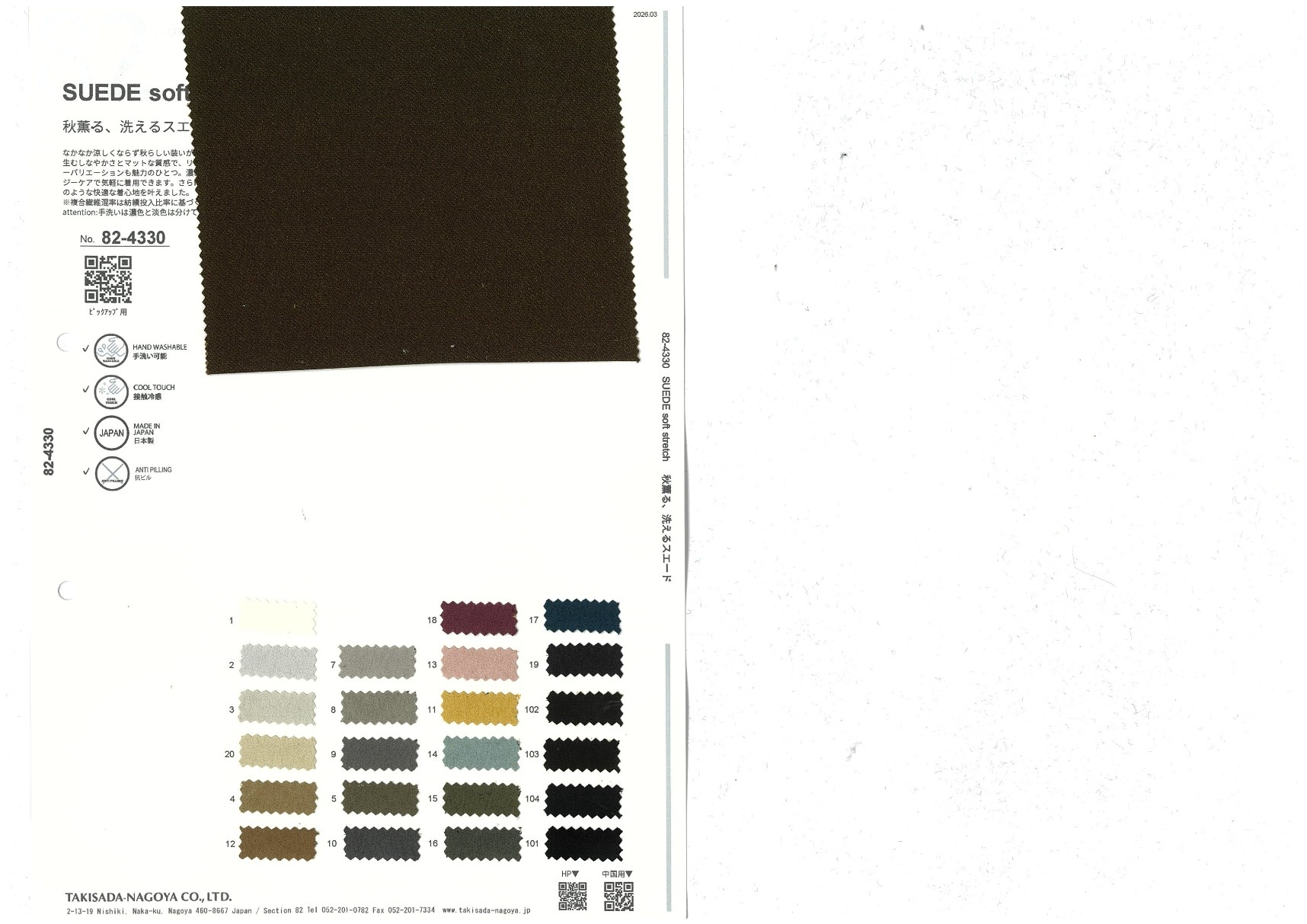 SUEDE soft stretch 添加到收藏夹中 82-4330 面料、混率 Polyester 75% 规格、尺寸 134cm x 50m 2026.03 放大的图像 色彩多样的放大图像 可持续的 回收 动物保护 可手洗 保温性能 接触冷感 吸汗速干 抗紫外线 抗皱 四门弹 防透光 抗沷水 日本产 意大利产 防风 抗菌防臭 抗病毒 吸湿发热 抗静电 除臭 抗起球 高弹性 吸光发热