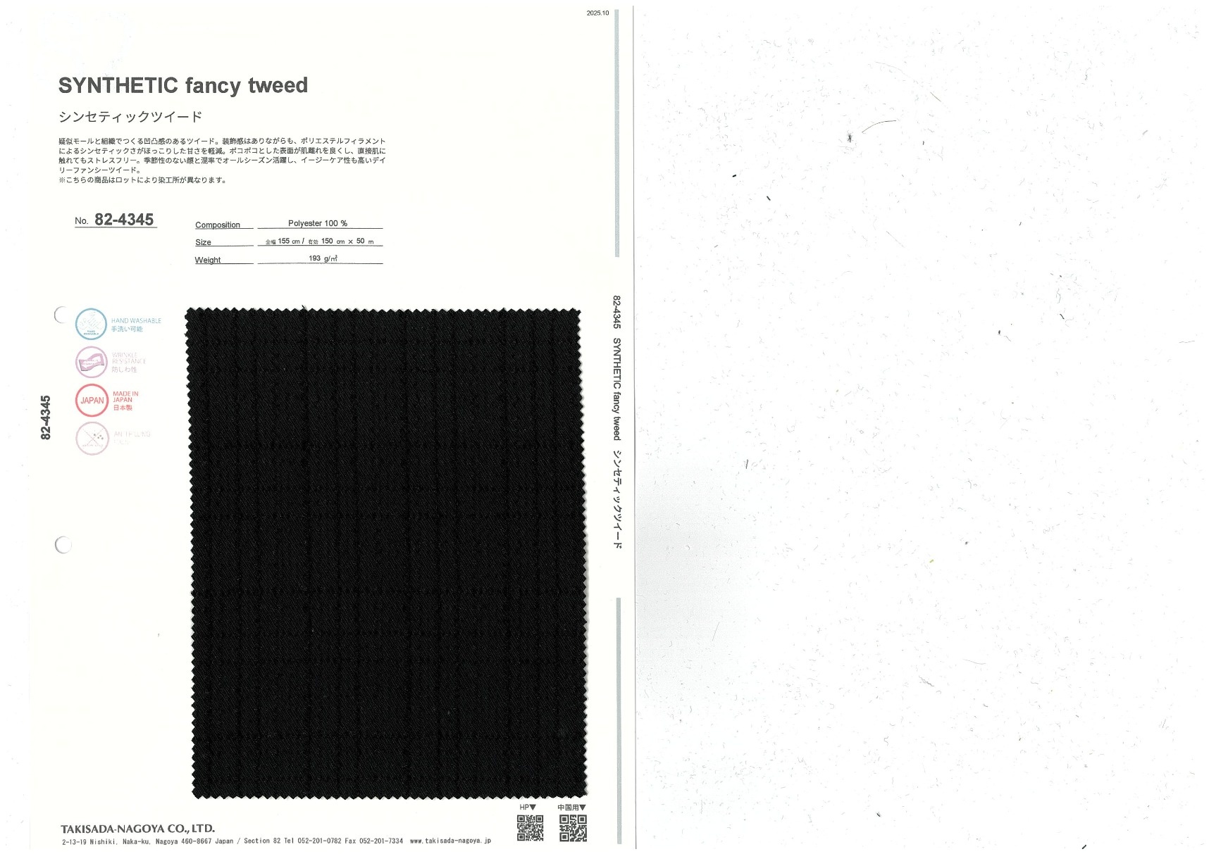 SYNTHETIC fancy tweed 添加到收藏夹中 82-4345 面料、混率 Polyester 100% 规格、尺寸 150cm x 50m 2025.10 放大的图像 色彩多样的放大图像 可持续的 回收 动物保护 可手洗 保温性能 接触冷感 吸汗速干 抗紫外线 抗皱 四门弹 防透光 抗沷水 日本产 意大利产 防风 抗菌防臭 抗病毒 吸湿发热 抗静电 除臭 抗起球 高弹性 吸光发热