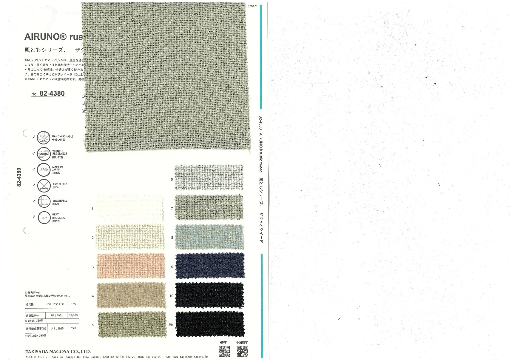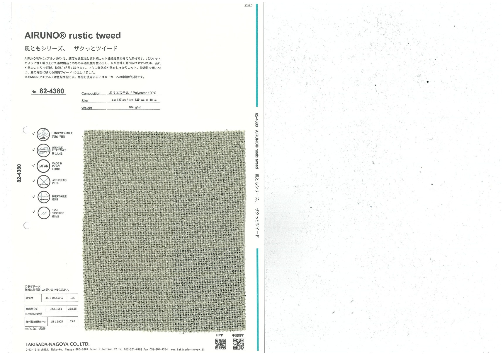 AIRUNO® rustic tweed 添加到收藏夹中 82-4380 面料、混率 Polyester 100% 规格、尺寸 125cm x 48m 2026.01 放大的图像 色彩多样的放大图像 可持续的 回收 动物保护 可手洗 保温性能 接触冷感 吸汗速干 抗紫外线 抗皱 四门弹 防透光 抗沷水 日本产 意大利产 防风 抗菌防臭 抗病毒 吸湿发热 抗静电 除臭 抗起球 高弹性 吸光发热