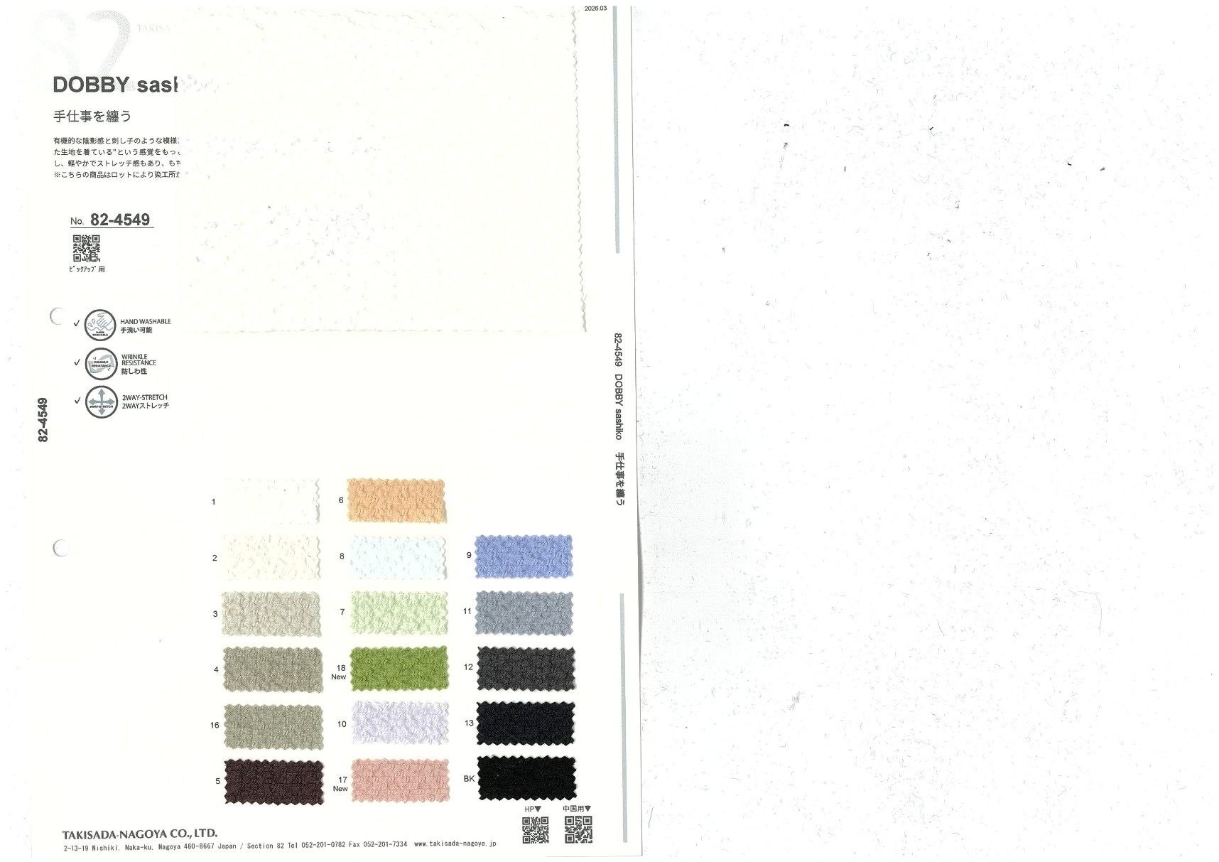 COTTONLINEN like sashiko 添加到收藏夹中 82-4549 面料、混率 Polyester 99% Polyurethane 1% 规格、尺寸 130cm x 50m 2026.03 放大的图像 色彩多样的放大图像 可持续的 回收 动物保护 可手洗 保温性能 接触冷感 吸汗速干 抗紫外线 抗皱 四门弹 防透光 抗沷水 日本产 意大利产 防风 抗菌防臭 抗病毒 吸湿发热 抗静电 除臭 抗起球 高弹性 吸光发热