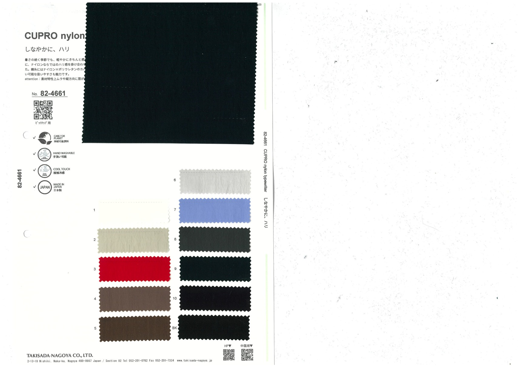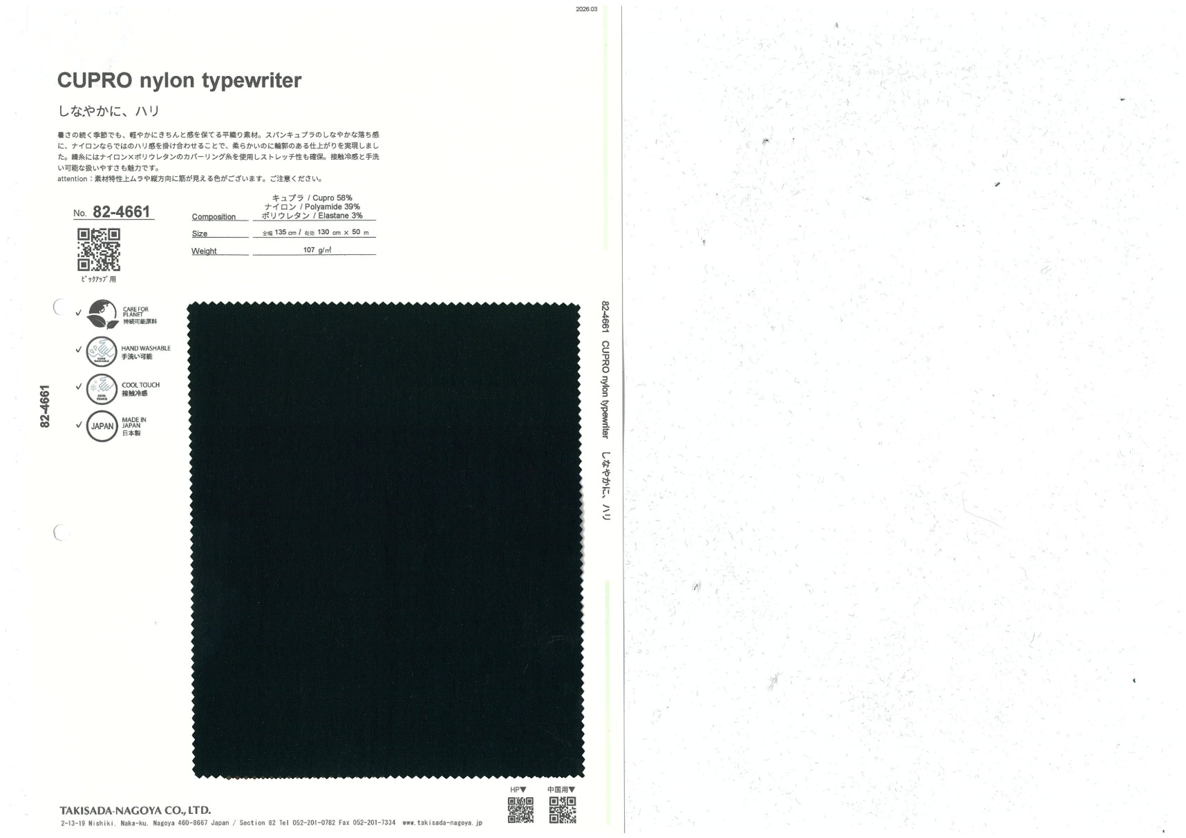 CUPRO nylon typewriter 添加到收藏夹中 82-4661 面料、混率 Cupra 58% Nylon 39% Polyurethane 3% 规格、尺寸 130cm x 50m 2026.03 放大的图像 色彩多样的放大图像 可持续的 回收 动物保护 可手洗 保温性能 接触冷感 吸汗速干 抗紫外线 抗皱 四门弹 防透光 抗沷水 日本产 意大利产 防风 抗菌防臭 抗病毒 吸湿发热 抗静电 除臭 抗起球 高弹性 吸光发热