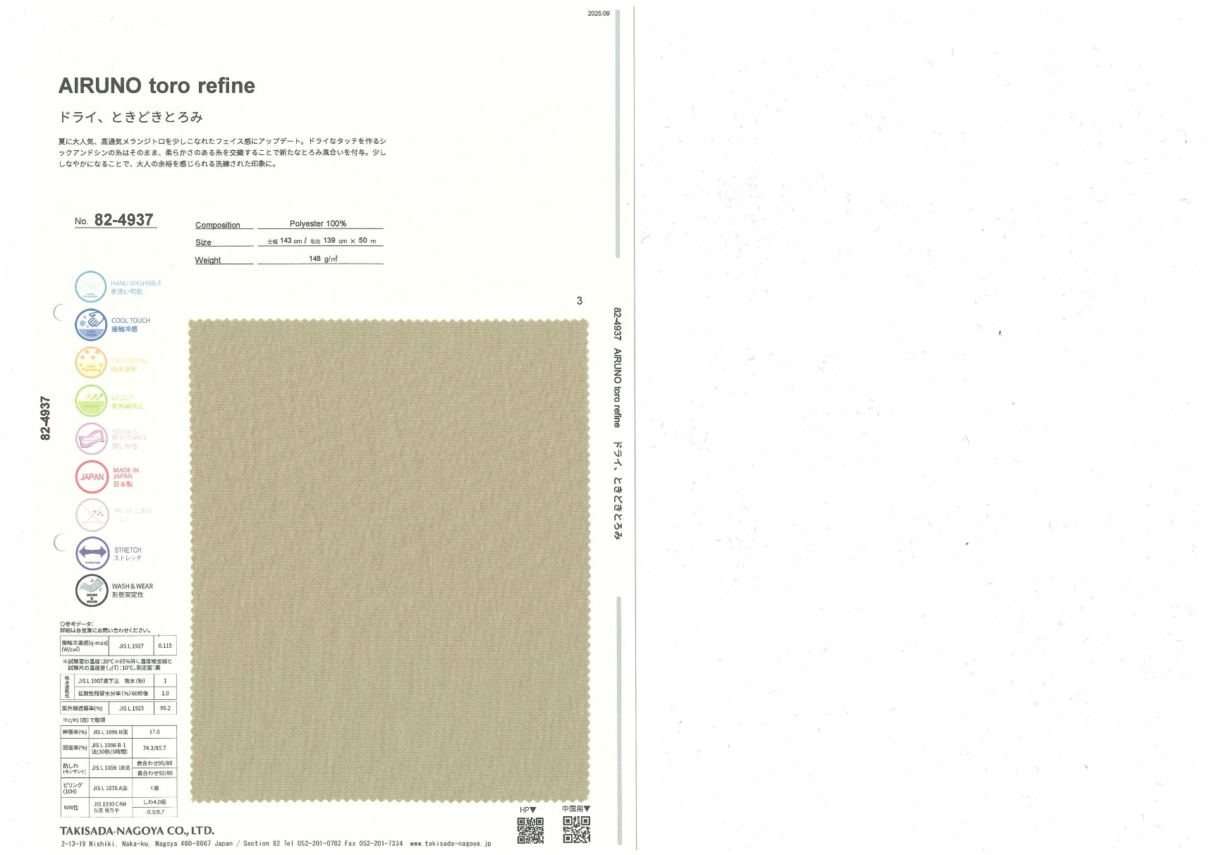 AIRUNO™ toro refine 添加到收藏夹中 82-4937 面料、混率 Polyester 100% 规格、尺寸 139cm x 50m 2025.09 放大的图像 可持续的 回收 动物保护 可手洗 保温性能 接触冷感 吸汗速干 抗紫外线 抗皱 四门弹 防透光 抗沷水 日本产 意大利产 防风 抗菌防臭 抗病毒 吸湿发热 抗静电 除臭 抗起球 高弹性 吸光发热