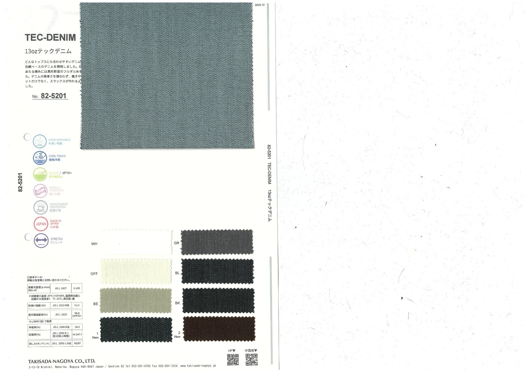 TEC-DENIM 添加到收藏夹中 82-5201 面料、混率 Polyester 98% Polyurethane 2% 规格、尺寸 130cm x 50m 2025.10 放大的图像 色彩多样的放大图像 可持续的 回收 动物保护 可手洗 保温性能 接触冷感 吸汗速干 抗紫外线 抗皱 四门弹 防透光 抗沷水 日本产 意大利产 防风 抗菌防臭 抗病毒 吸湿发热 抗静电 除臭 抗起球 高弹性 吸光发热