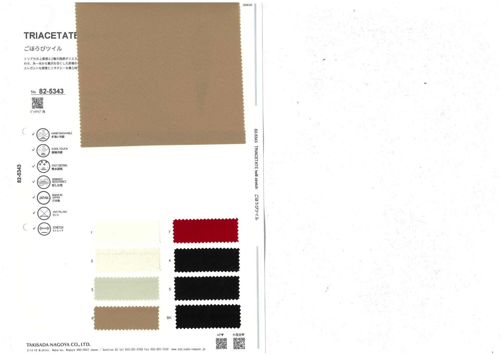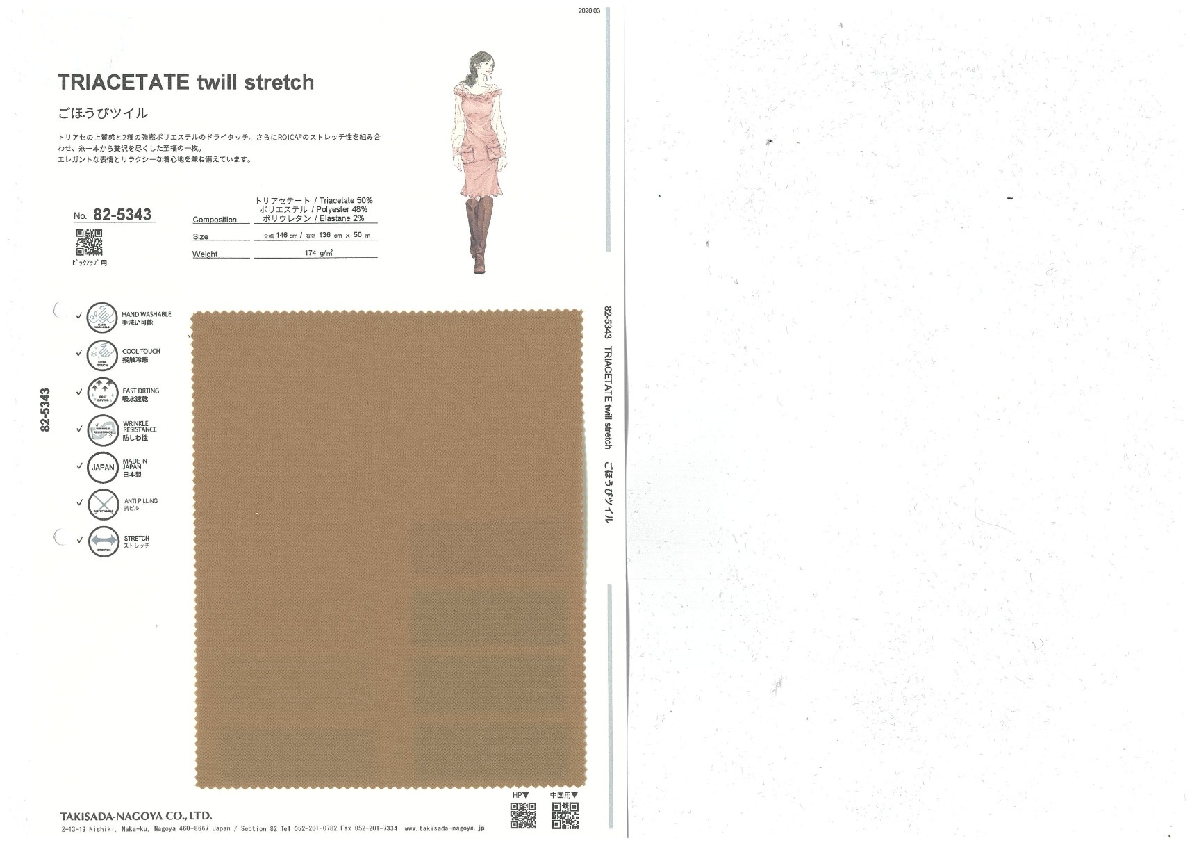 TRIACETATE twill stretch 添加到收藏夹中 82-5343 面料、混率 Triacetate 50% Polyester 48% Polyurethane 2% 规格、尺寸 136cm x 50m 2026.03 放大的图像 色彩多样的放大图像 可持续的 回收 动物保护 可手洗 保温性能 接触冷感 吸汗速干 抗紫外线 抗皱 四门弹 防透光 抗沷水 日本产 意大利产 防风 抗菌防臭 抗病毒 吸湿发热 抗静电 除臭 抗起球 高弹性 吸光发热