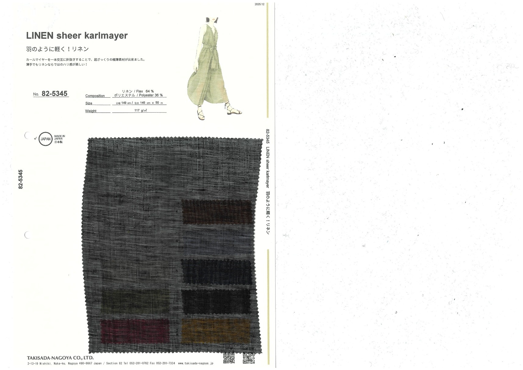 LINEN sheer karlmayer 添加到收藏夹中 82-5345 面料、混率 Linen 64% Polyester 36% 规格、尺寸 145cm x 50m 2025.12 放大的图像 色彩多样的放大图像 可持续的 回收 动物保护 可手洗 保温性能 接触冷感 吸汗速干 抗紫外线 抗皱 四门弹 防透光 抗沷水 日本产 意大利产 防风 抗菌防臭 抗病毒 吸湿发热 抗静电 除臭 抗起球 高弹性 吸光发热