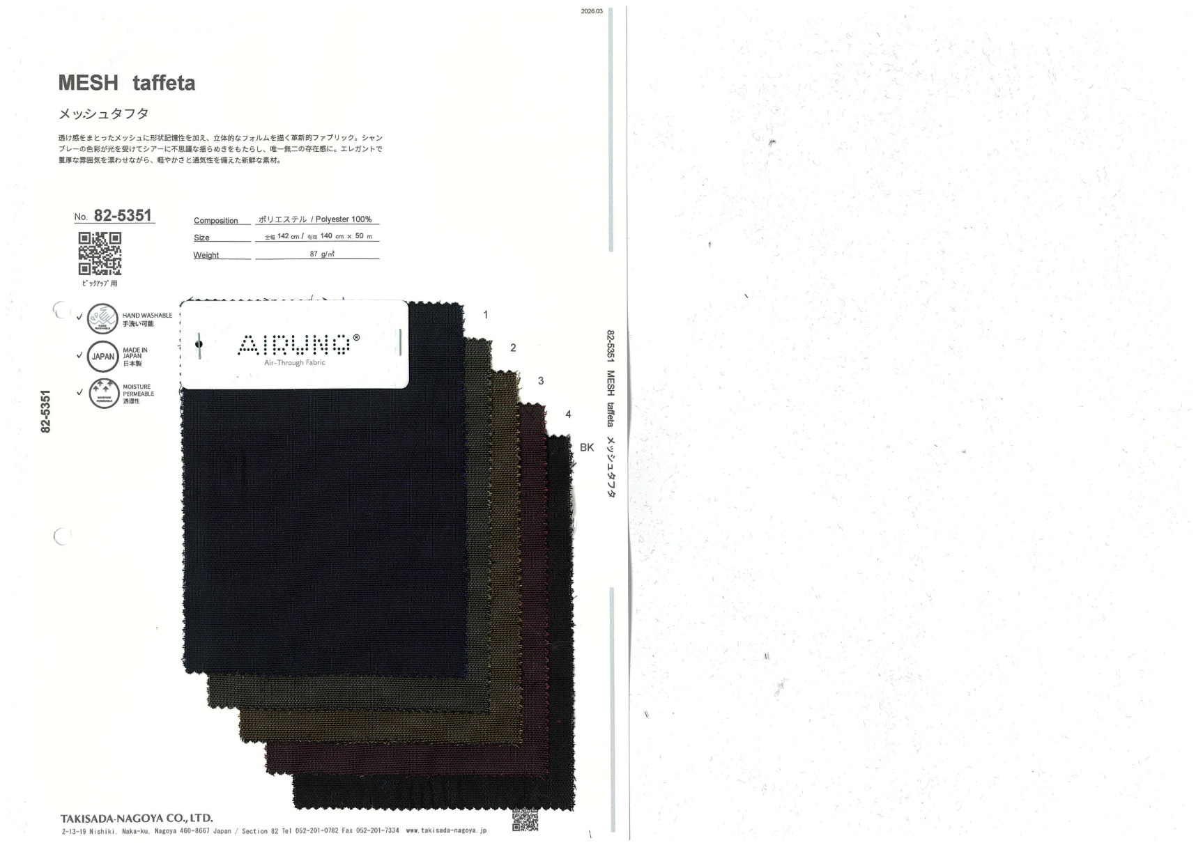 MESH taffeta 添加到收藏夹中 82-5351 面料、混率 Polyester 100% 规格、尺寸 140cm x 50m 2026.03 放大的图像 可持续的 回收 动物保护 可手洗 保温性能 接触冷感 吸汗速干 抗紫外线 抗皱 四门弹 防透光 抗沷水 日本产 意大利产 防风 抗菌防臭 抗病毒 吸湿发热 抗静电 除臭 抗起球 高弹性 吸光发热