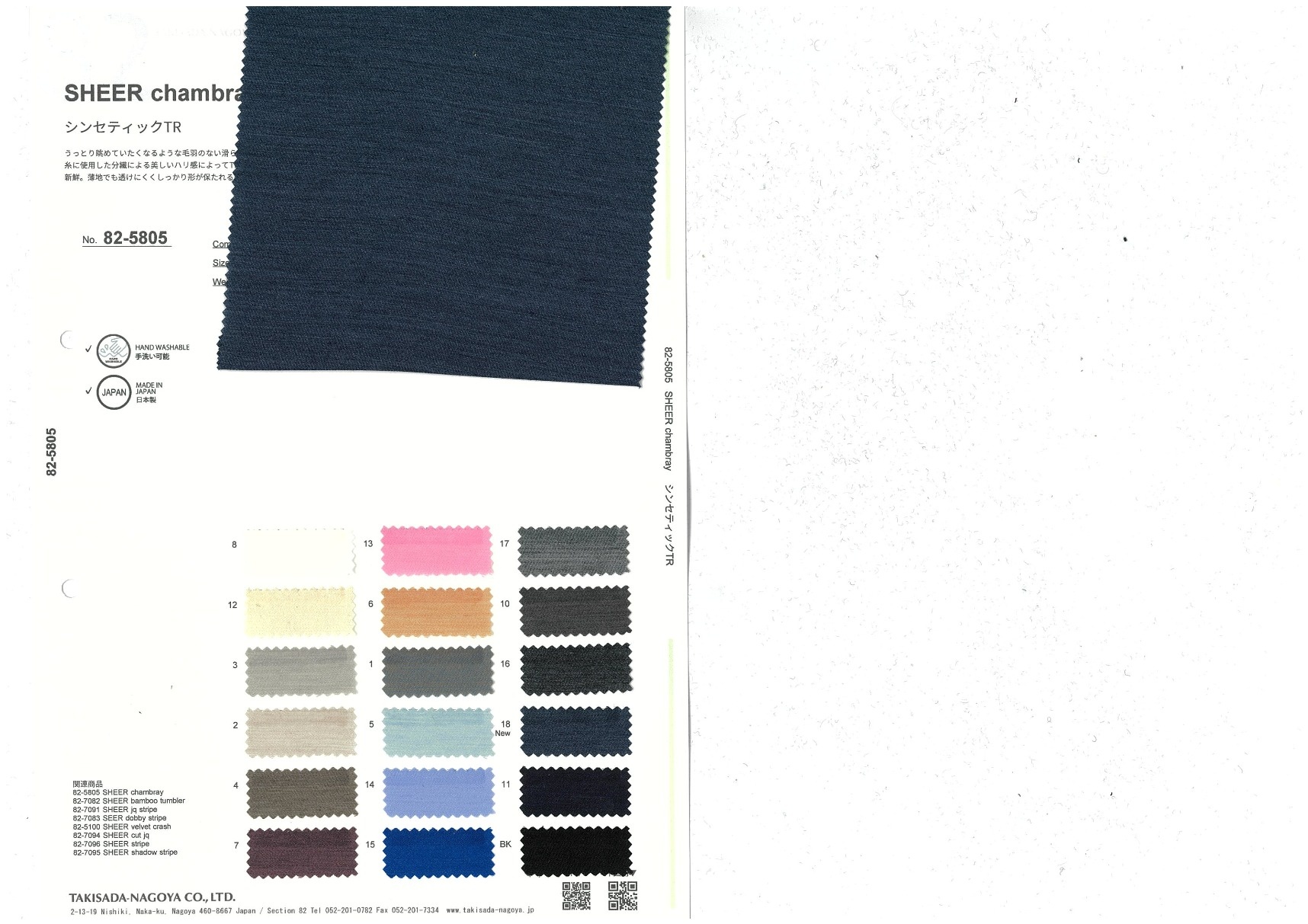 SHEER chambray 添加到收藏夹中 82-5805 面料、混率 Polyester 74% Rayon 26% 规格、尺寸 140cm x 50m 2026.01 放大的图像 色彩多样的放大图像 可持续的 回收 动物保护 可手洗 保温性能 接触冷感 吸汗速干 抗紫外线 抗皱 四门弹 防透光 抗沷水 日本产 意大利产 防风 抗菌防臭 抗病毒 吸湿发热 抗静电 除臭 抗起球 高弹性 吸光发热