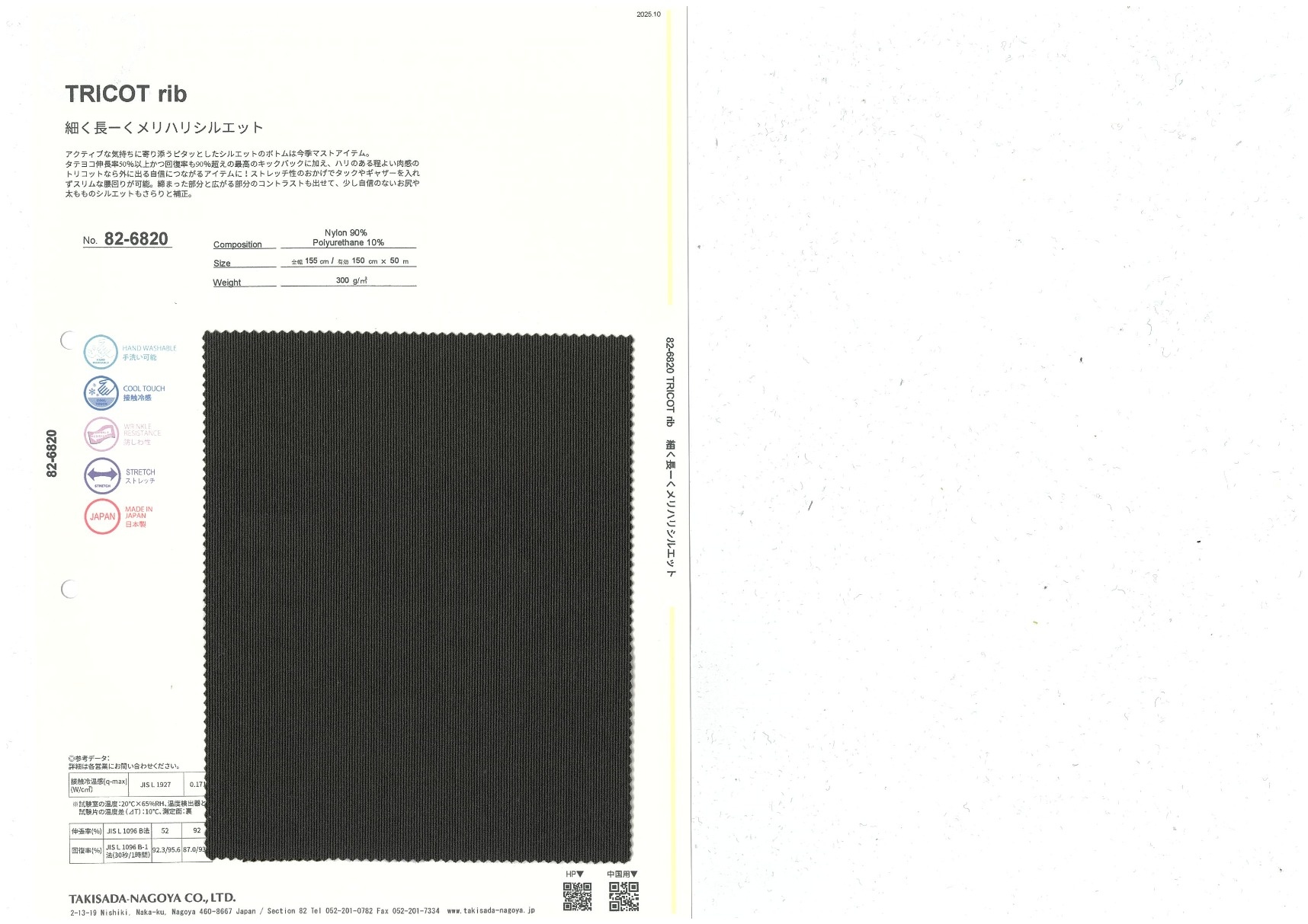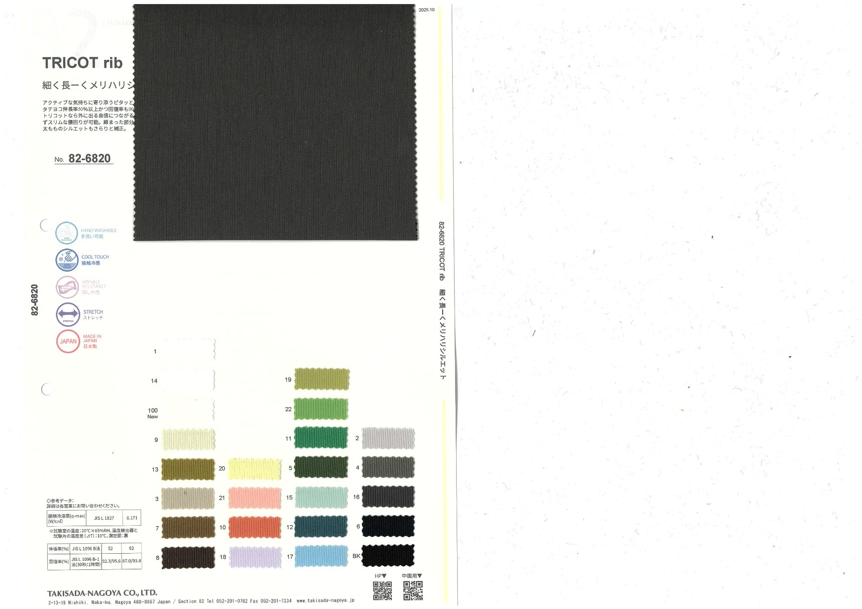 TRICOT rib 添加到收藏夹中 82-6820 面料、混率 Nylon 90% Polyurethane 10% 规格、尺寸 150cm x 50m 2025.10 放大的图像 色彩多样的放大图像 可持续的 回收 动物保护 可手洗 保温性能 接触冷感 吸汗速干 抗紫外线 抗皱 四门弹 防透光 抗沷水 日本产 意大利产 防风 抗菌防臭 抗病毒 吸湿发热 抗静电 除臭 抗起球 高弹性 吸光发热