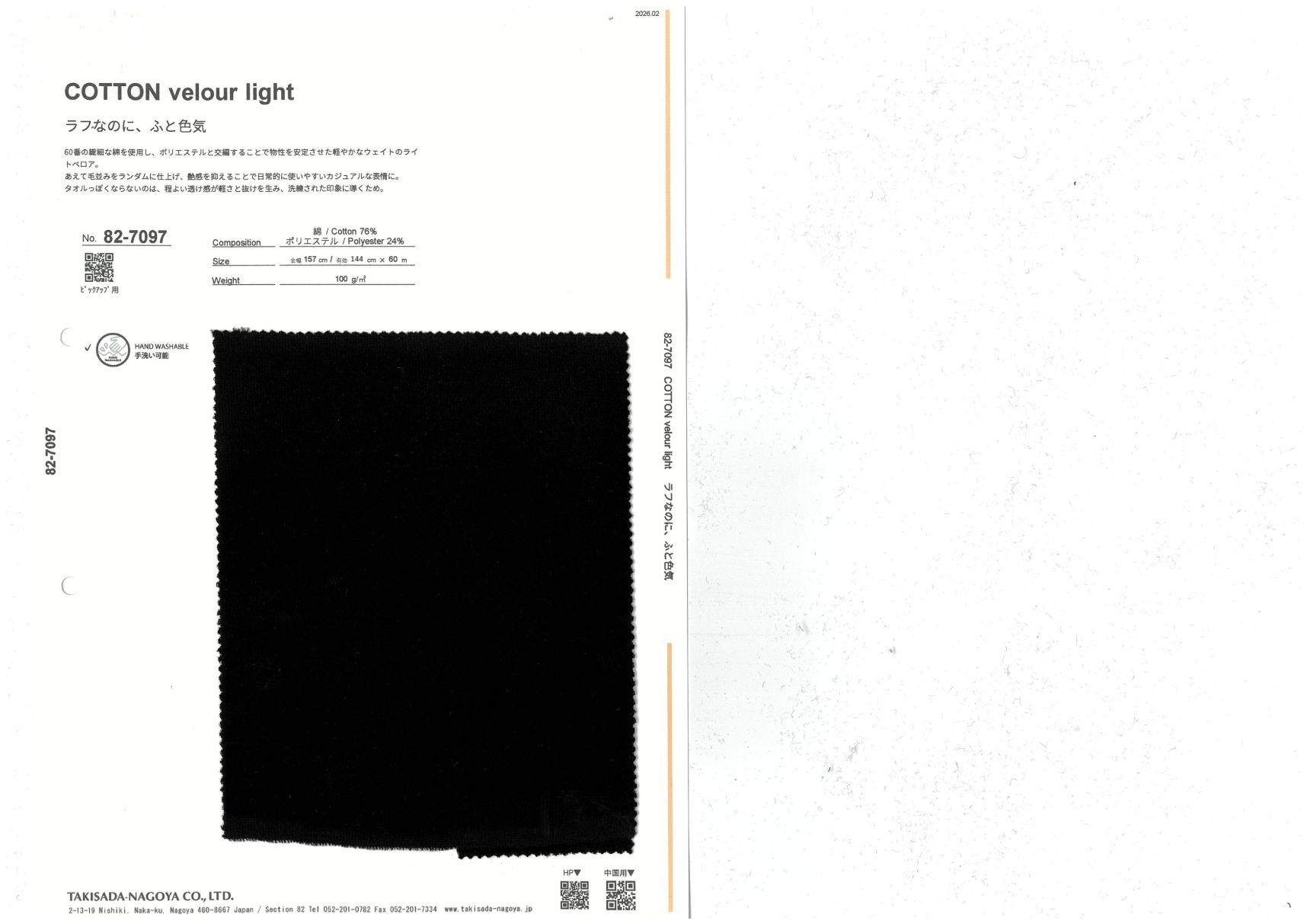COTTON velour light 添加到收藏夹中 82-7097 面料、混率 Cotton 76% Polyester 24% 规格、尺寸 144cm x 60m 2026.02 放大的图像 色彩多样的放大图像 可持续的 回收 动物保护 可手洗 保温性能 接触冷感 吸汗速干 抗紫外线 抗皱 四门弹 防透光 抗沷水 日本产 意大利产 防风 抗菌防臭 抗病毒 吸湿发热 抗静电 除臭 抗起球 高弹性 吸光发热