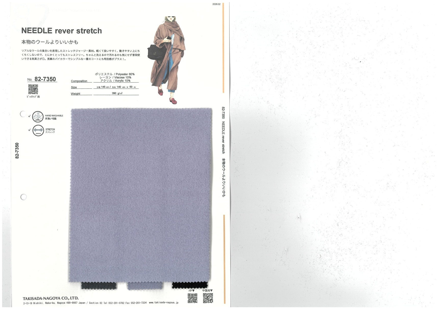 NEEDLE rever stretch 添加到收藏夹中 82-7350 面料、混率 Polyester 80% Rayon 10% Acrylic 10% 规格、尺寸 140cm x 50m 预定停产商品 2026.02 放大的图像 色彩多样的放大图像 可持续的 回收 动物保护 可手洗 保温性能 接触冷感 吸汗速干 抗紫外线 抗皱 四门弹 防透光 抗沷水 日本产 意大利产 防风 抗菌防臭 抗病毒 吸湿发热 抗静电 除臭 抗起球 高弹性 吸光发热