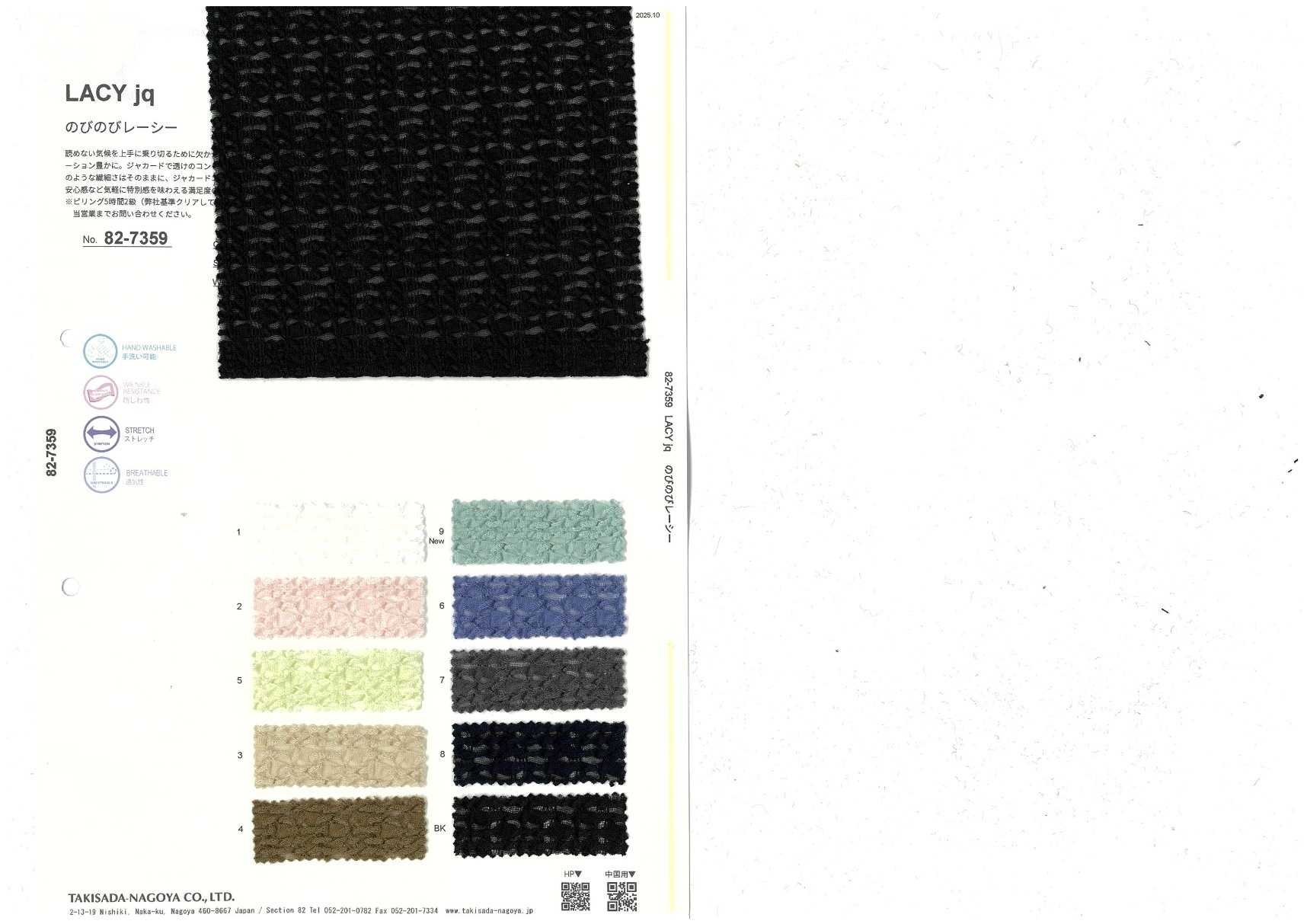 LACY jq 添加到收藏夹中 82-7359 面料、混率 Polyester 72% Rayon 25% Polyurethane 3% 规格、尺寸 130cm x 50m 2025.10 放大的图像 色彩多样的放大图像 可持续的 回收 动物保护 可手洗 保温性能 接触冷感 吸汗速干 抗紫外线 抗皱 四门弹 防透光 抗沷水 日本产 意大利产 防风 抗菌防臭 抗病毒 吸湿发热 抗静电 除臭 抗起球 高弹性 吸光发热