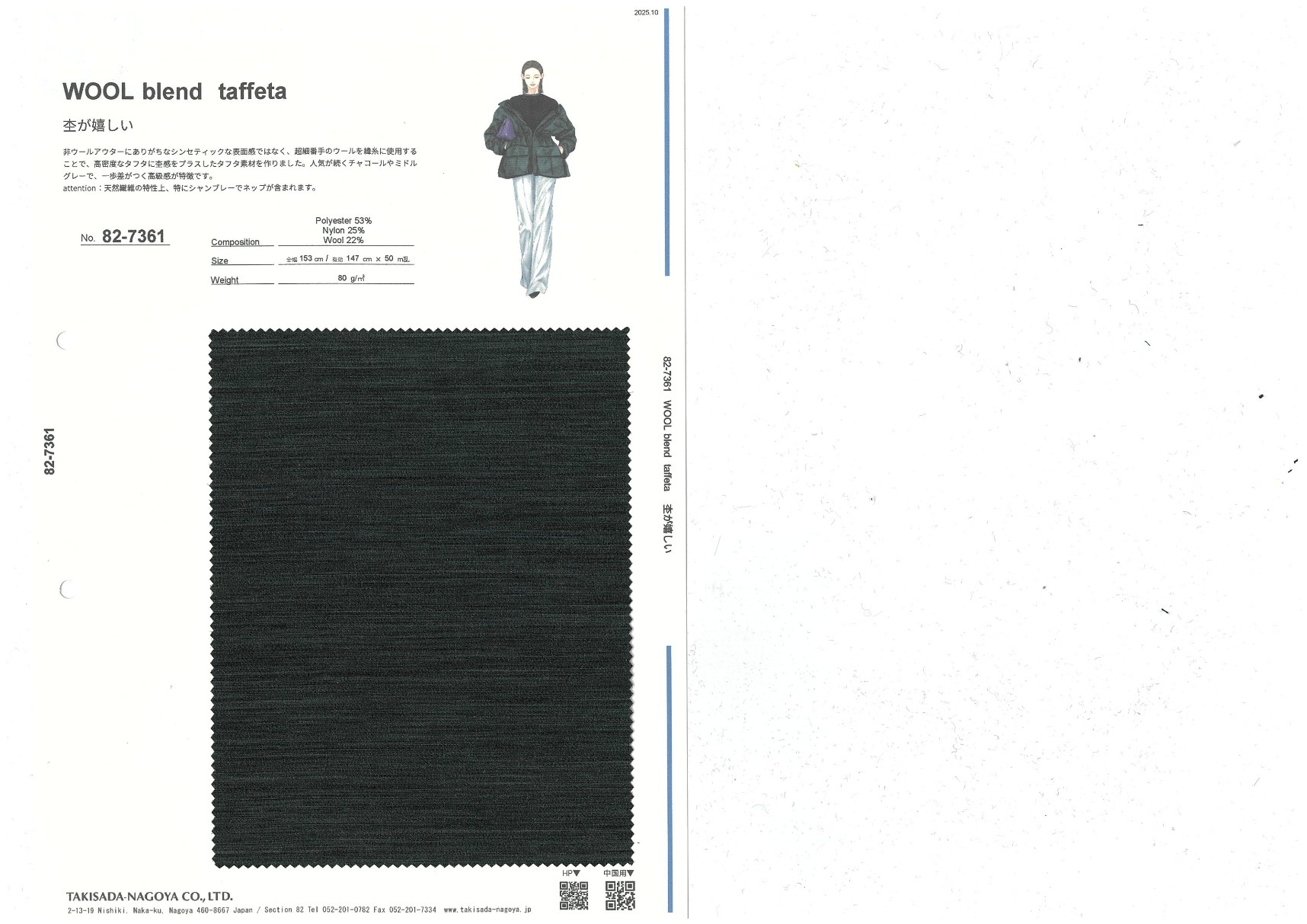 WOOL blend taffeta 添加到收藏夹中 82-7361 面料、混率 Polyester 53% Nylon 25% Wool 22% 规格、尺寸 147cm x 50m 2025.10 放大的图像 色彩多样的放大图像 可持续的 回收 动物保护 可手洗 保温性能 接触冷感 吸汗速干 抗紫外线 抗皱 四门弹 防透光 抗沷水 日本产 意大利产 防风 抗菌防臭 抗病毒 吸湿发热 抗静电 除臭 抗起球 高弹性 吸光发热