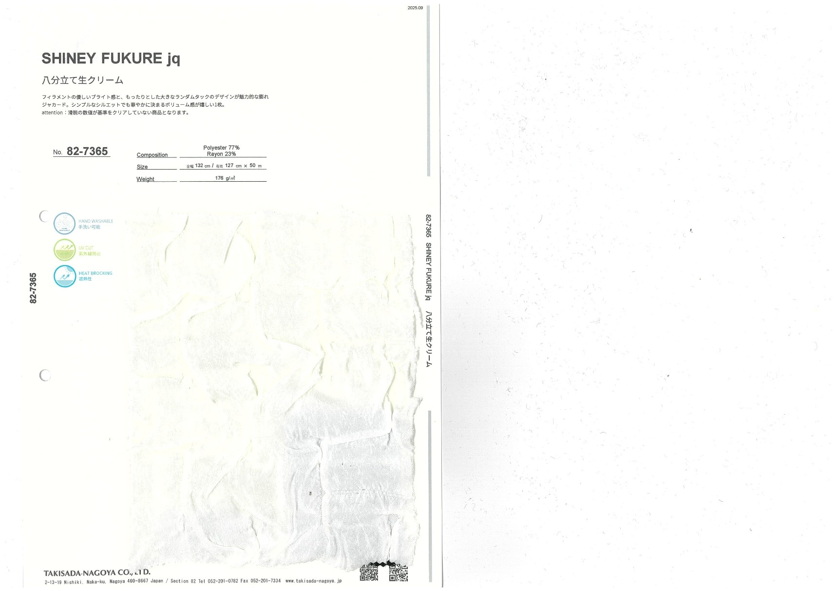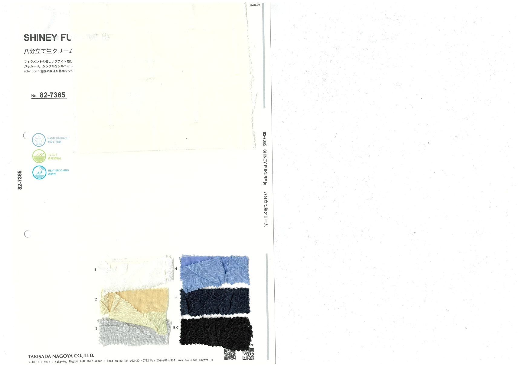 SHINEY FUKURE jq 添加到收藏夹中 82-7365 面料、混率 Polyester 77% Rayon 23% 规格、尺寸 127cm x 50m 2025.09 放大的图像 色彩多样的放大图像 可持续的 回收 动物保护 可手洗 保温性能 接触冷感 吸汗速干 抗紫外线 抗皱 四门弹 防透光 抗沷水 日本产 意大利产 防风 抗菌防臭 抗病毒 吸湿发热 抗静电 除臭 抗起球 高弹性 吸光发热