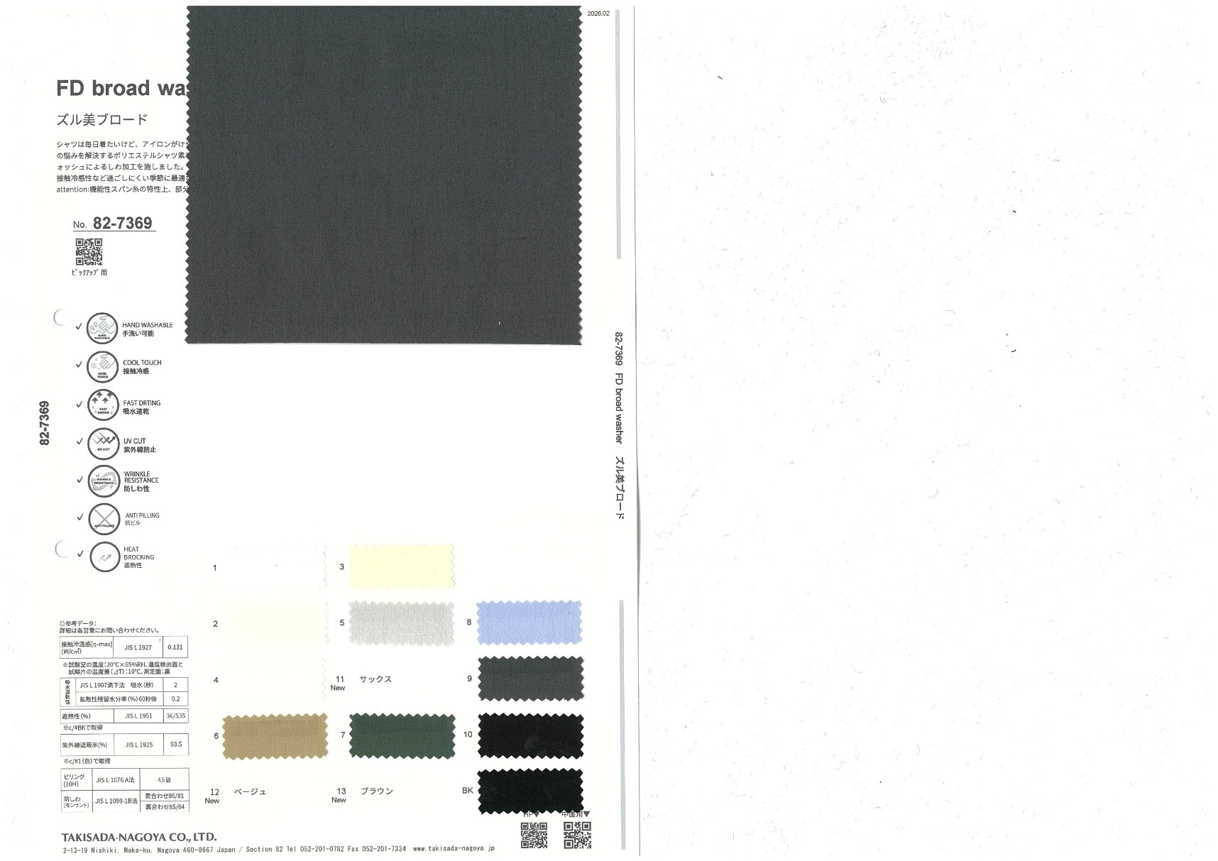 FD broad washer 添加到收藏夹中 82-7369 面料、混率 Polyester 100% 规格、尺寸 132cm x 50m 2026.02 放大的图像 色彩多样的放大图像 可持续的 回收 动物保护 可手洗 保温性能 接触冷感 吸汗速干 抗紫外线 抗皱 四门弹 防透光 抗沷水 日本产 意大利产 防风 抗菌防臭 抗病毒 吸湿发热 抗静电 除臭 抗起球 高弹性 吸光发热