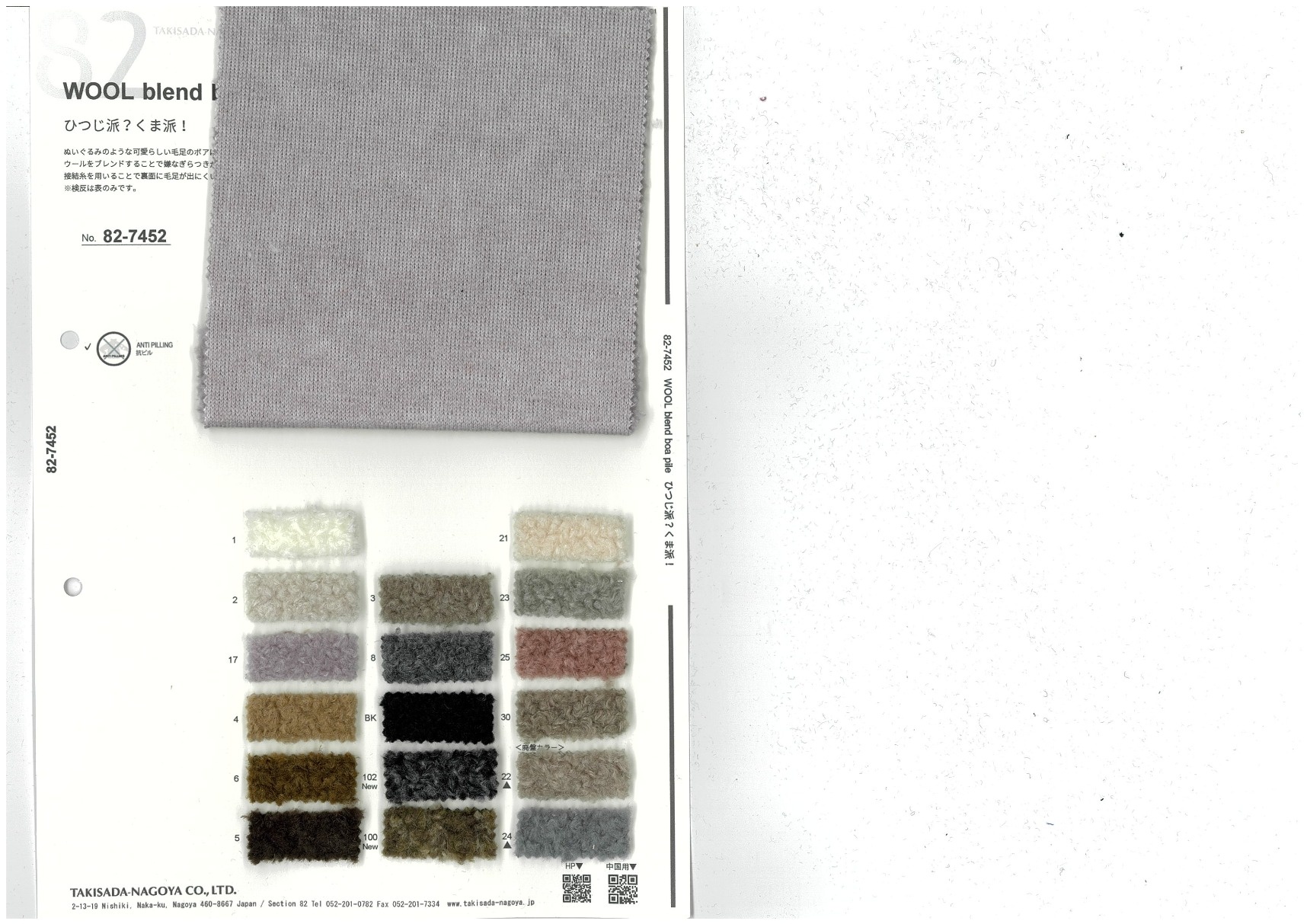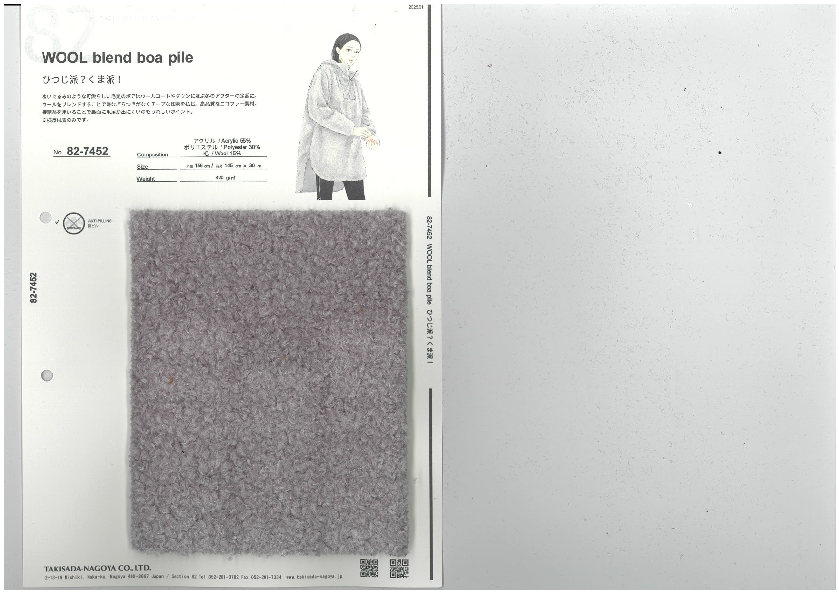 WOOL blend boa pile 添加到收藏夹中 82-7452 面料、混率 Acrylic 55% Polyester 30% Wool 15% 规格、尺寸 145cm x 30m 2026.01 放大的图像 色彩多样的放大图像 可持续的 回收 动物保护 可手洗 保温性能 接触冷感 吸汗速干 抗紫外线 抗皱 四门弹 防透光 抗沷水 日本产 意大利产 防风 抗菌防臭 抗病毒 吸湿发热 抗静电 除臭 抗起球 高弹性 吸光发热