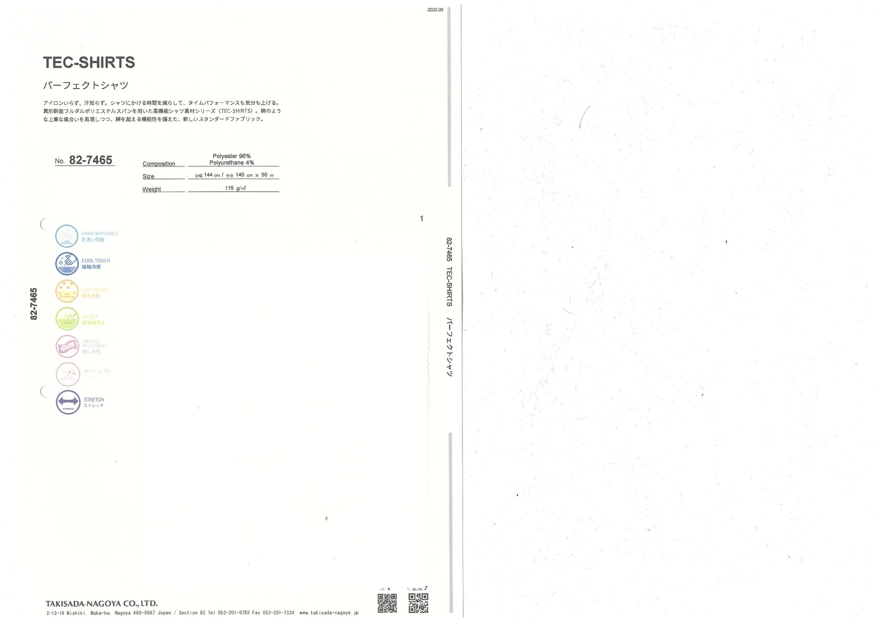 TEC-SHIRTS 添加到收藏夹中 82-7465 面料、混率 Polyester 96% Polyurethane 4% 规格、尺寸 140cm x 50m 2025.09 放大的图像 可持续的 回收 动物保护 可手洗 保温性能 接触冷感 吸汗速干 抗紫外线 抗皱 四门弹 防透光 抗沷水 日本产 意大利产 防风 抗菌防臭 抗病毒 吸湿发热 抗静电 除臭 抗起球 高弹性 吸光发热