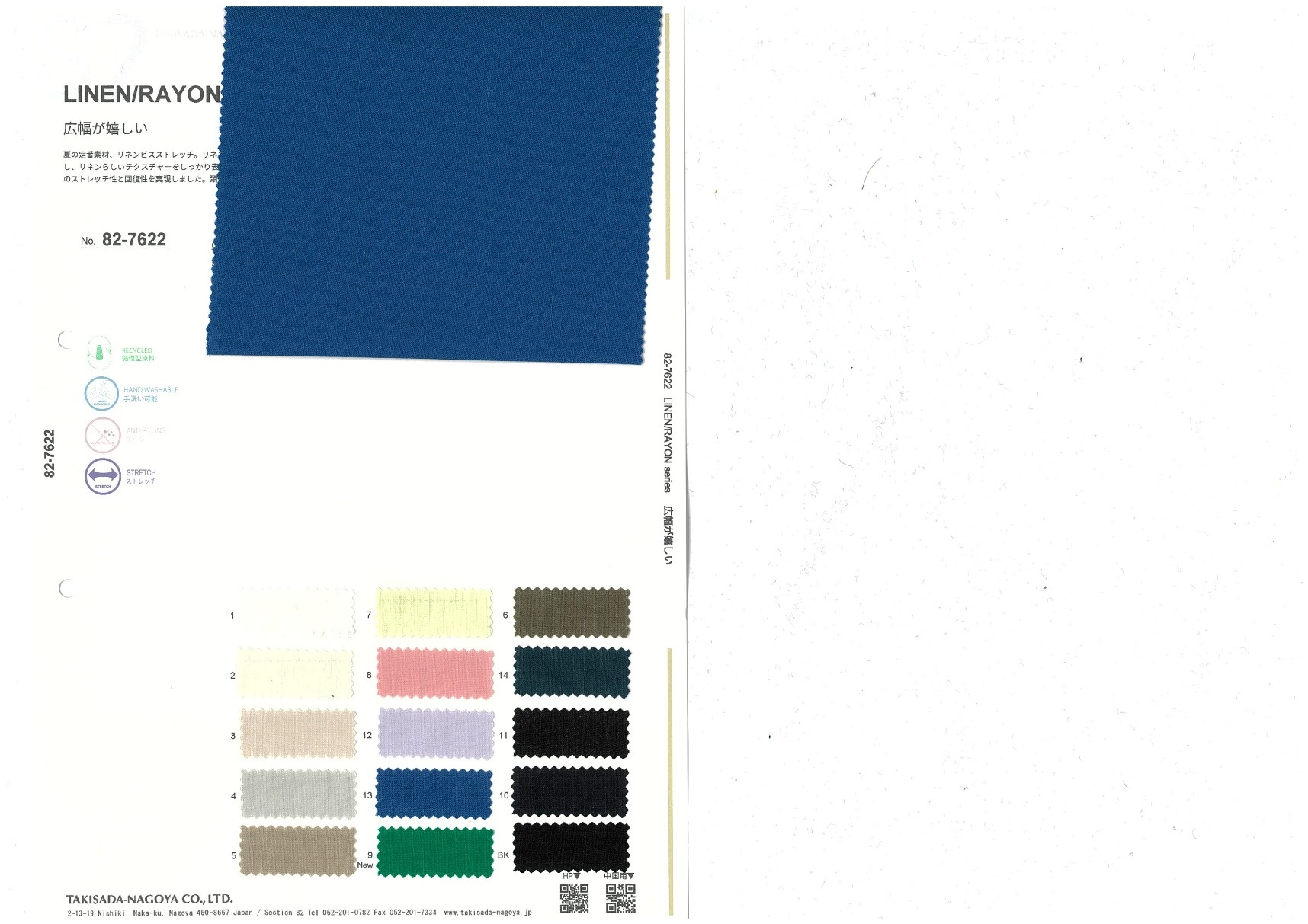 LINEN/RAYON series 添加到收藏夹中 82-7622 面料、混率 Linen 26% Rayon 26% Polyurethane 2% 规格、尺寸 140cm x 50m 2025.09 放大的图像 色彩多样的放大图像 可持续的 回收 动物保护 可手洗 保温性能 接触冷感 吸汗速干 抗紫外线 抗皱 四门弹 防透光 抗沷水 日本产 意大利产 防风 抗菌防臭 抗病毒 吸湿发热 抗静电 除臭 抗起球 高弹性 吸光发热