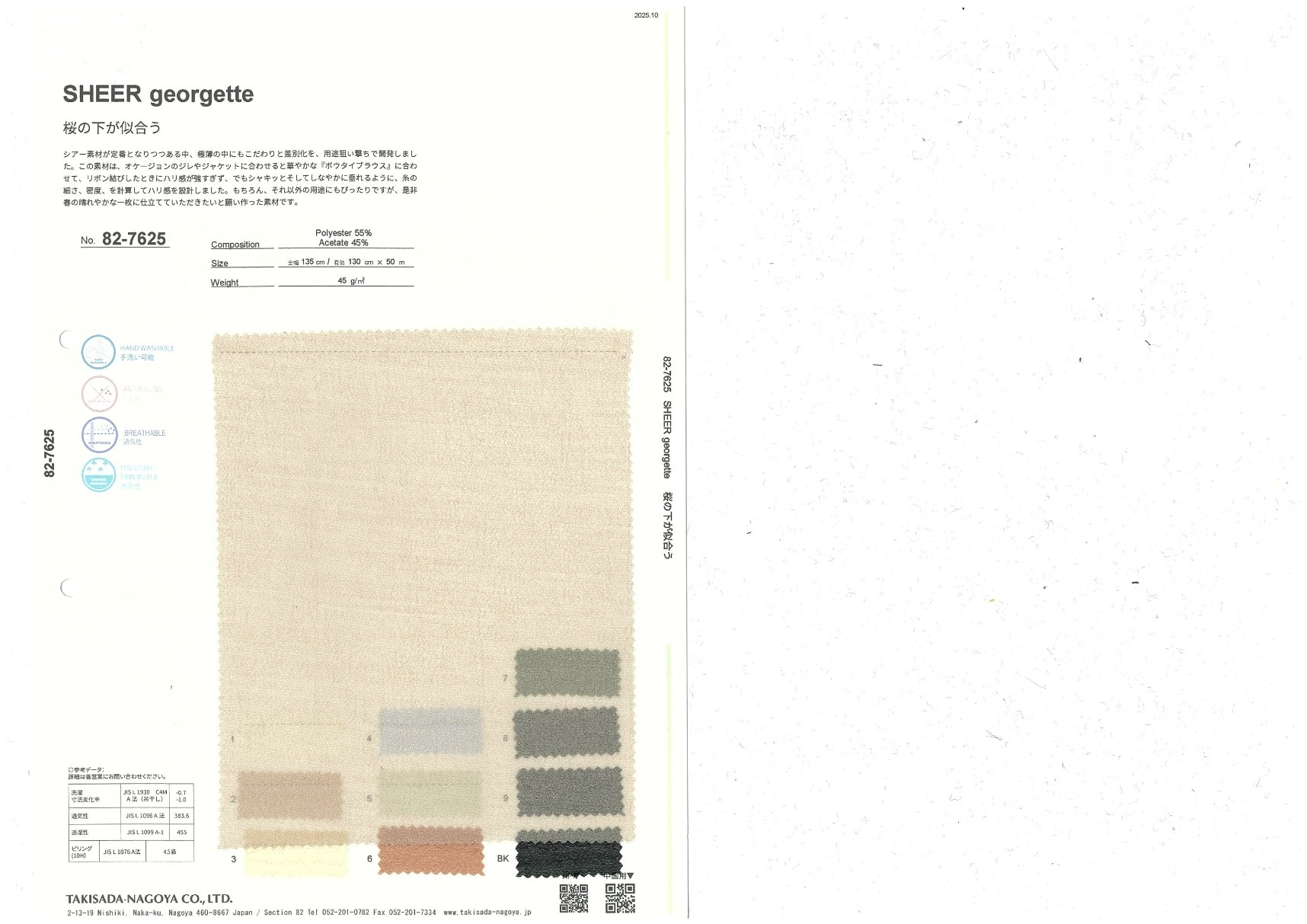 SHEER georgette 添加到收藏夹中 82-7625 面料、混率 Polyester 55% Acetate 45% 规格、尺寸 130cm x 50m 2025.10 放大的图像 色彩多样的放大图像 可持续的 回收 动物保护 可手洗 保温性能 接触冷感 吸汗速干 抗紫外线 抗皱 四门弹 防透光 抗沷水 日本产 意大利产 防风 抗菌防臭 抗病毒 吸湿发热 抗静电 除臭 抗起球 高弹性 吸光发热