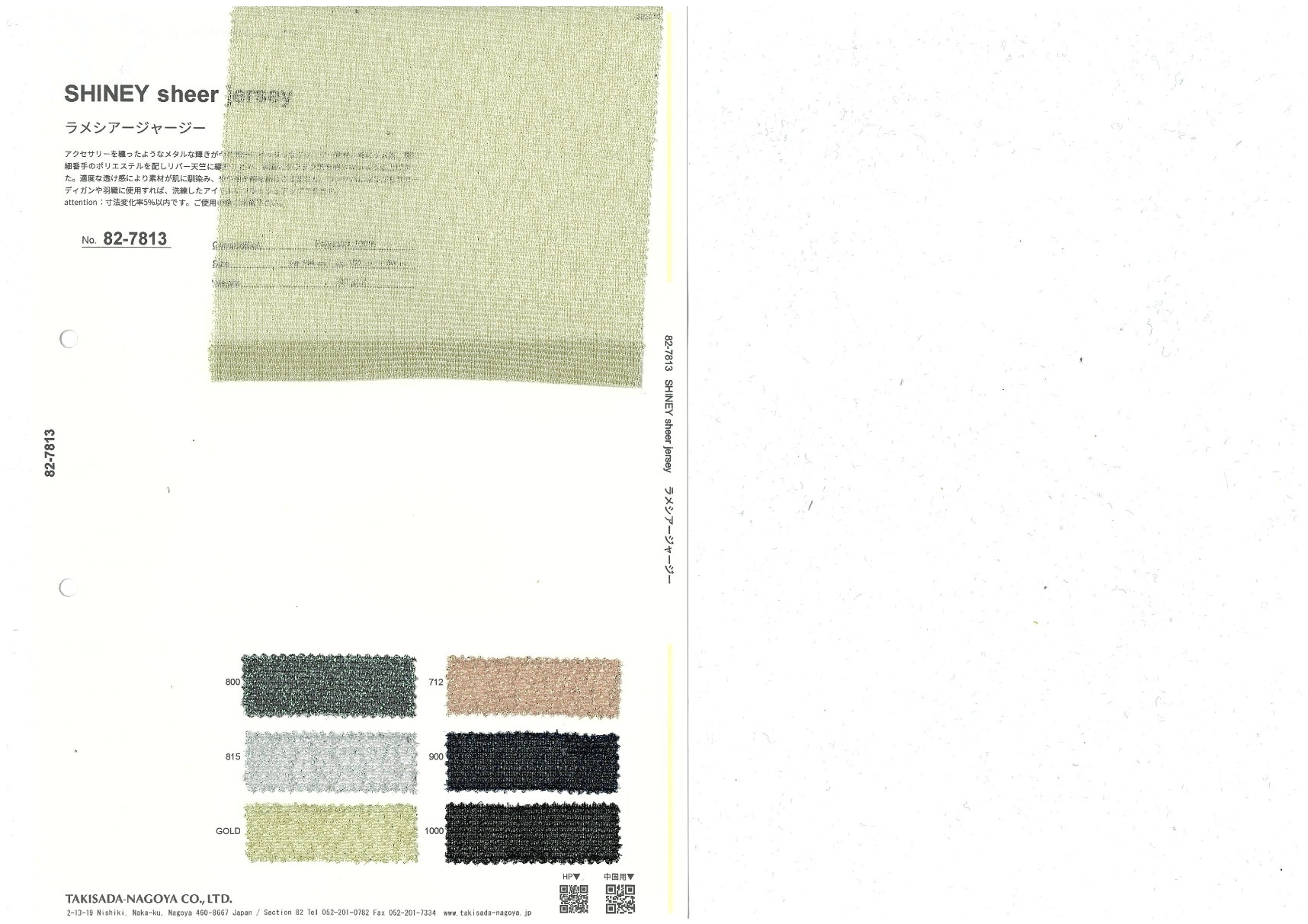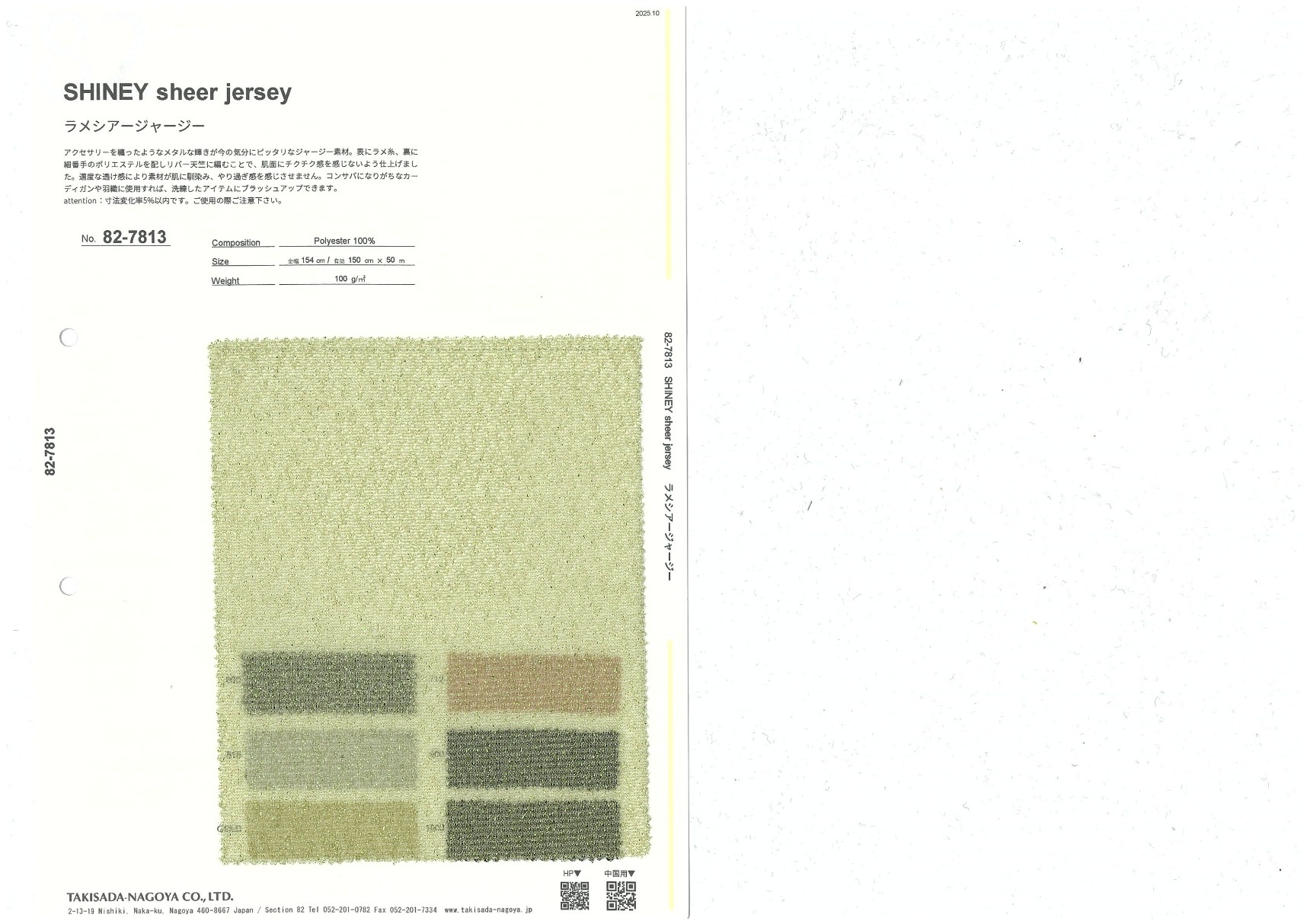 SHINEY sheer jersey 添加到收藏夹中 82-7813 面料、混率 Polyester 100% 规格、尺寸 150cm x 50m 2025.10 放大的图像 色彩多样的放大图像 可持续的 回收 动物保护 可手洗 保温性能 接触冷感 吸汗速干 抗紫外线 抗皱 四门弹 防透光 抗沷水 日本产 意大利产 防风 抗菌防臭 抗病毒 吸湿发热 抗静电 除臭 抗起球 高弹性 吸光发热
