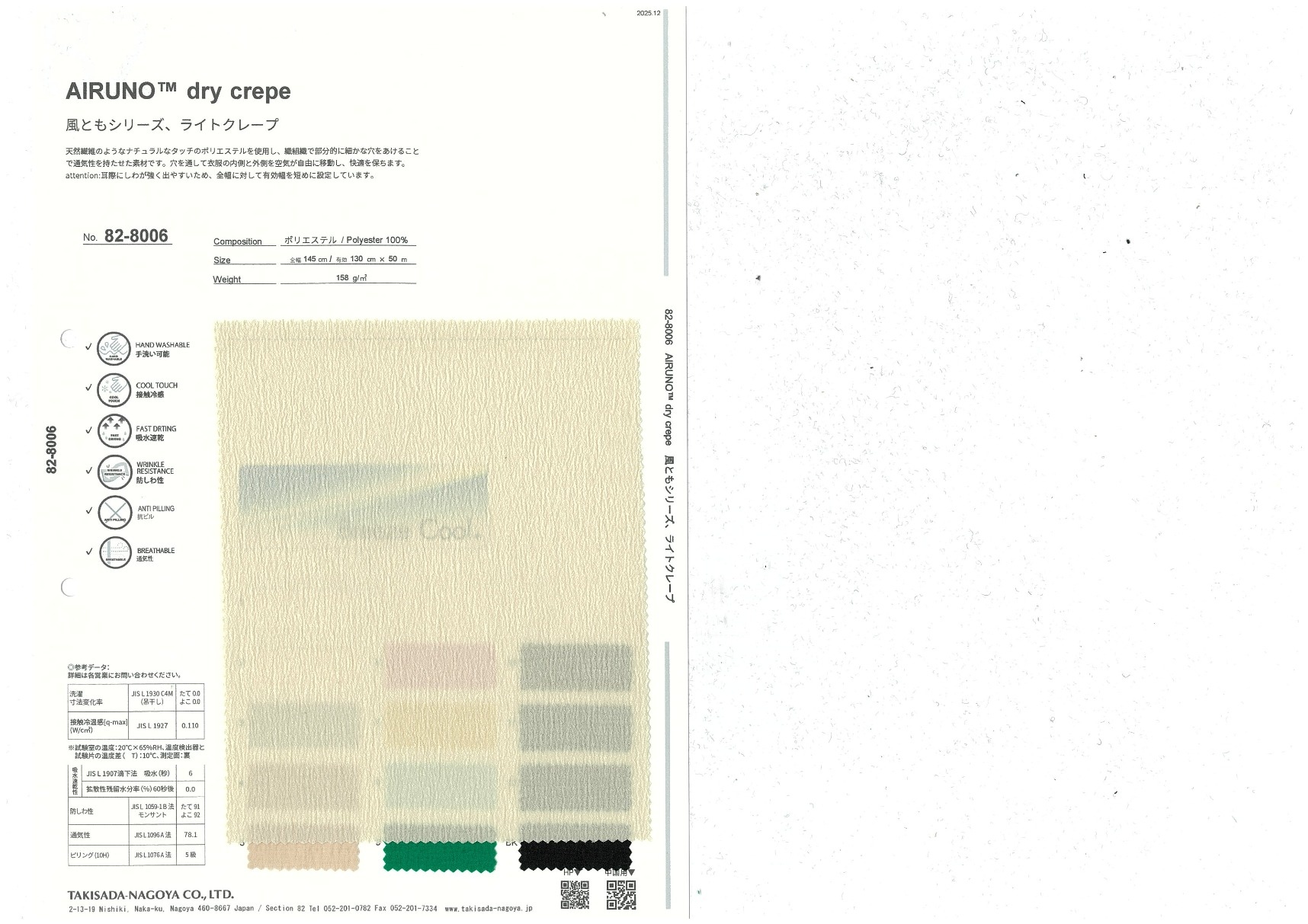 BREEZE dry crepe 添加到收藏夹中 82-8006 面料、混率 Polyester 100% 规格、尺寸 130cm x 50m 2026.01 放大的图像 色彩多样的放大图像 可持续的 回收 动物保护 可手洗 保温性能 接触冷感 吸汗速干 抗紫外线 抗皱 四门弹 防透光 抗沷水 日本产 意大利产 防风 抗菌防臭 抗病毒 吸湿发热 抗静电 除臭 抗起球 高弹性 吸光发热