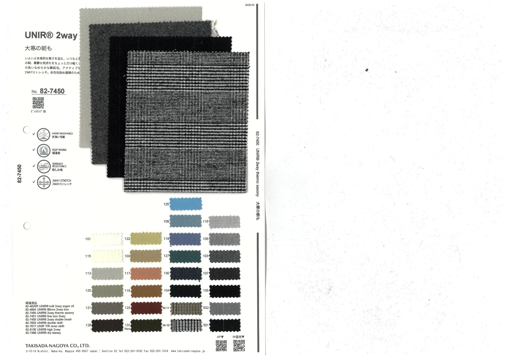 UNIR®2way thermo saxony 添加到收藏夹中 82-7450 面料、混率 Polyester 46% Rayon 34% Acrylic 16% Polyurethane 4% 规格、尺寸 132cm x 50m 2026.03 放大的图像 色彩多样的放大图像 可持续的 回收 动物保护 可手洗 保温性能 接触冷感 吸汗速干 抗紫外线 抗皱 四门弹 防透光 抗沷水 日本产 意大利产 防风 抗菌防臭 抗病毒 吸湿发热 抗静电 除臭 抗起球 高弹性 吸光发热