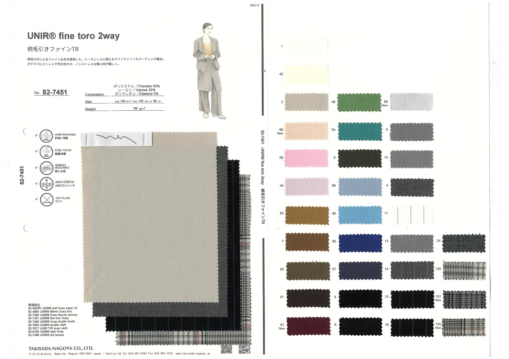 UNIR®fine toro 2way 添加到收藏夹中 82-7451 面料、混率 Polyester 63% Rayon 32% Polyurethane 5% 规格、尺寸 135cm x 50m 2025.12 放大的图像 可持续的 回收 动物保护 可手洗 保温性能 接触冷感 吸汗速干 抗紫外线 抗皱 四门弹 防透光 抗沷水 日本产 意大利产 防风 抗菌防臭 抗病毒 吸湿发热 抗静电 除臭 抗起球 高弹性 吸光发热