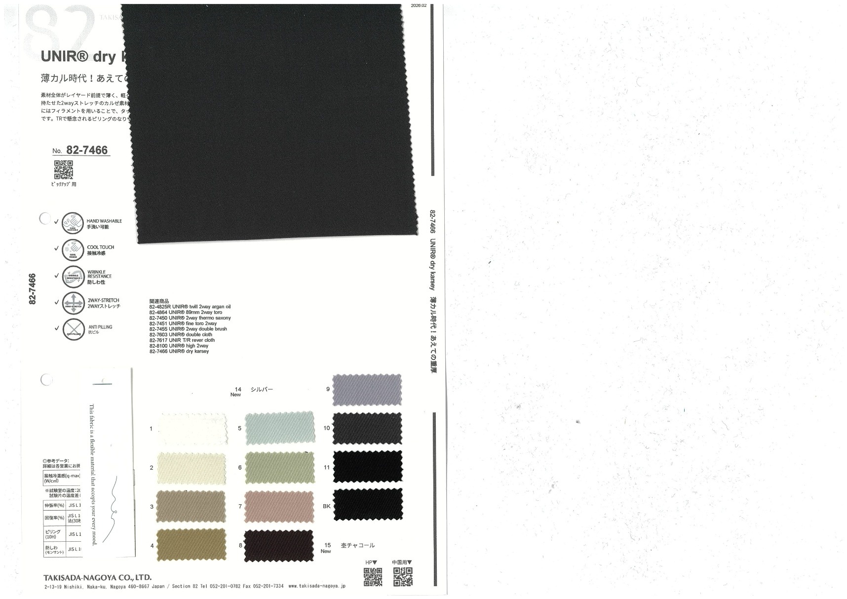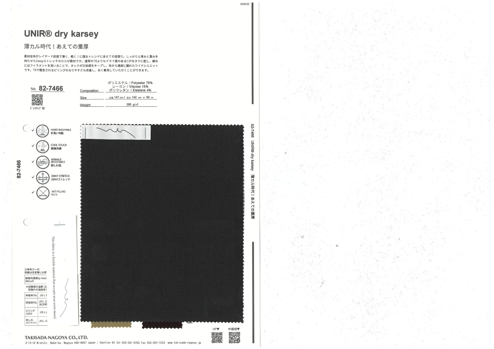 UNIR® dry karsey 添加到收藏夹中 82-7466 面料、混率 Polyester 78% Rayon 18% Polyurethane 4% 规格、尺寸 142cm x 50m 2026.02 放大的图像 色彩多样的放大图像 可持续的 回收 动物保护 可手洗 保温性能 接触冷感 吸汗速干 抗紫外线 抗皱 四门弹 防透光 抗沷水 日本产 意大利产 防风 抗菌防臭 抗病毒 吸湿发热 抗静电 除臭 抗起球 高弹性 吸光发热