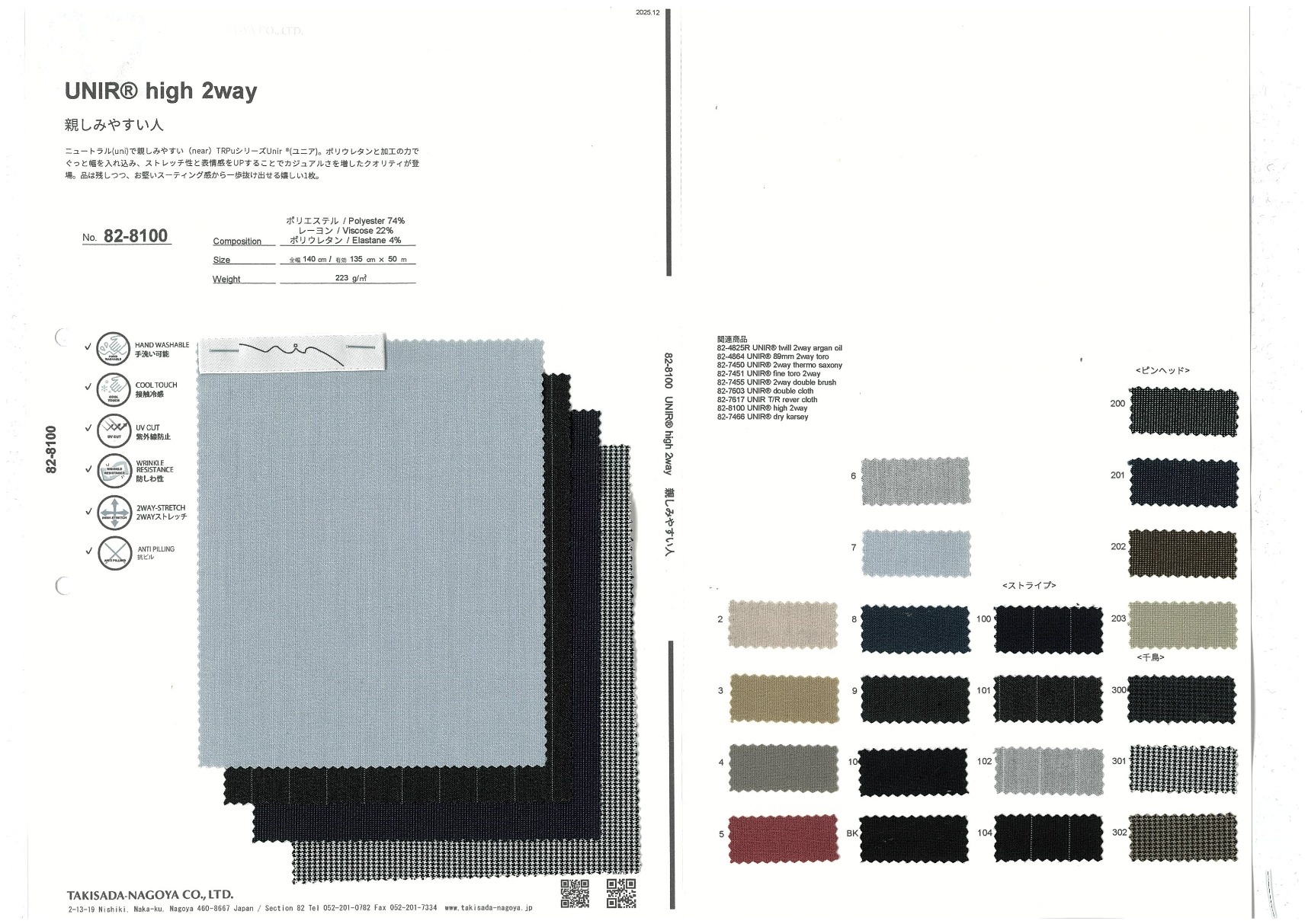 UNIR® high 2way 添加到收藏夹中 82-8100 面料、混率 Polyester 74% Rayon 22% Polyurethane 4% 规格、尺寸 135cm x 50m 2025.12 放大的图像 可持续的 回收 动物保护 可手洗 保温性能 接触冷感 吸汗速干 抗紫外线 抗皱 四门弹 防透光 抗沷水 日本产 意大利产 防风 抗菌防臭 抗病毒 吸湿发热 抗静电 除臭 抗起球 高弹性 吸光发热