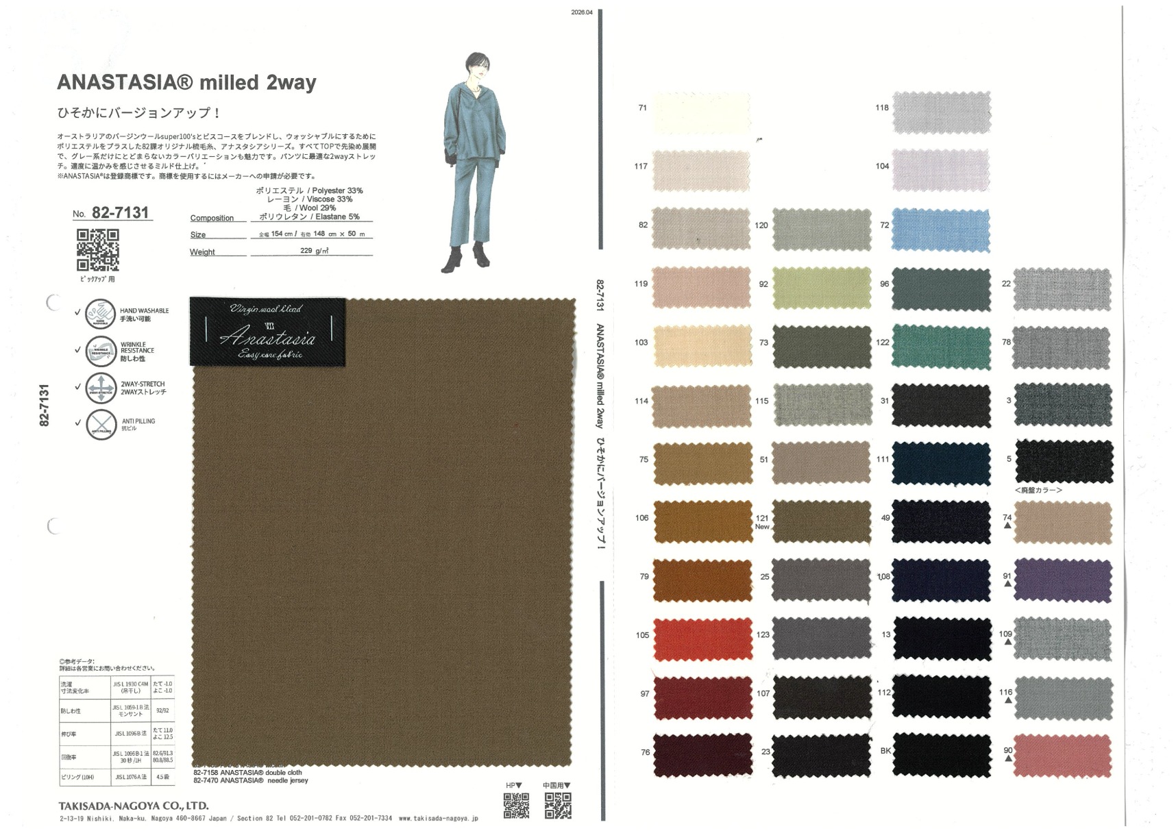 ANASTASIA系列是82课原创的可水洗羊毛混纺面料。在纺纱阶段将产自澳大利亚的初剪羊毛、粘胶纤维和涤纶进行混纺,再以特殊的方法加入氨纶制造而成。此款缩绒萨克森法兰绒经缩绒加工,保暖性好并具有双向伸缩性。混入的粘胶纤维赋予面料悬垂感,适用于今年流行的牧人裤及宽松裤等。