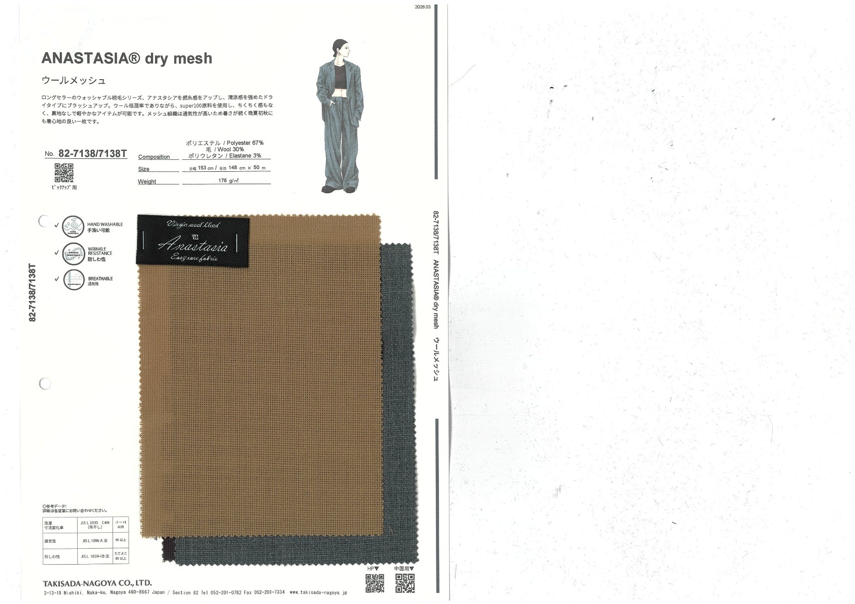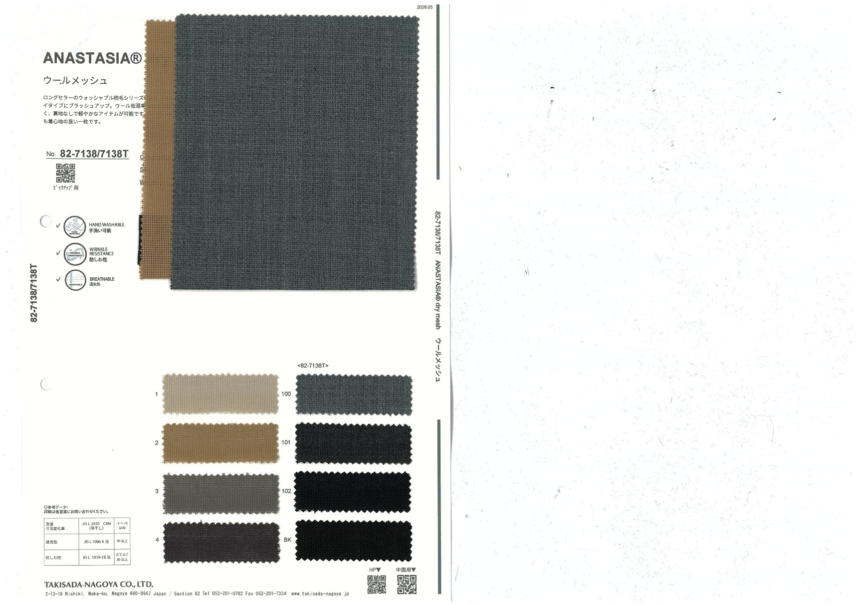 ANASTASIA® dry mesh 添加到收藏夹中 82-7138/7138T 面料、混率 Polyester 67% Wool 30% Polyurethane 3% 规格、尺寸 148cm x 50m 2026.03 放大的图像 色彩多样的放大图像 可持续的 回收 动物保护 可手洗 保温性能 接触冷感 吸汗速干 抗紫外线 抗皱 四门弹 防透光 抗沷水 日本产 意大利产 防风 抗菌防臭 抗病毒 吸湿发热 抗静电 除臭 抗起球 高弹性 吸光发热