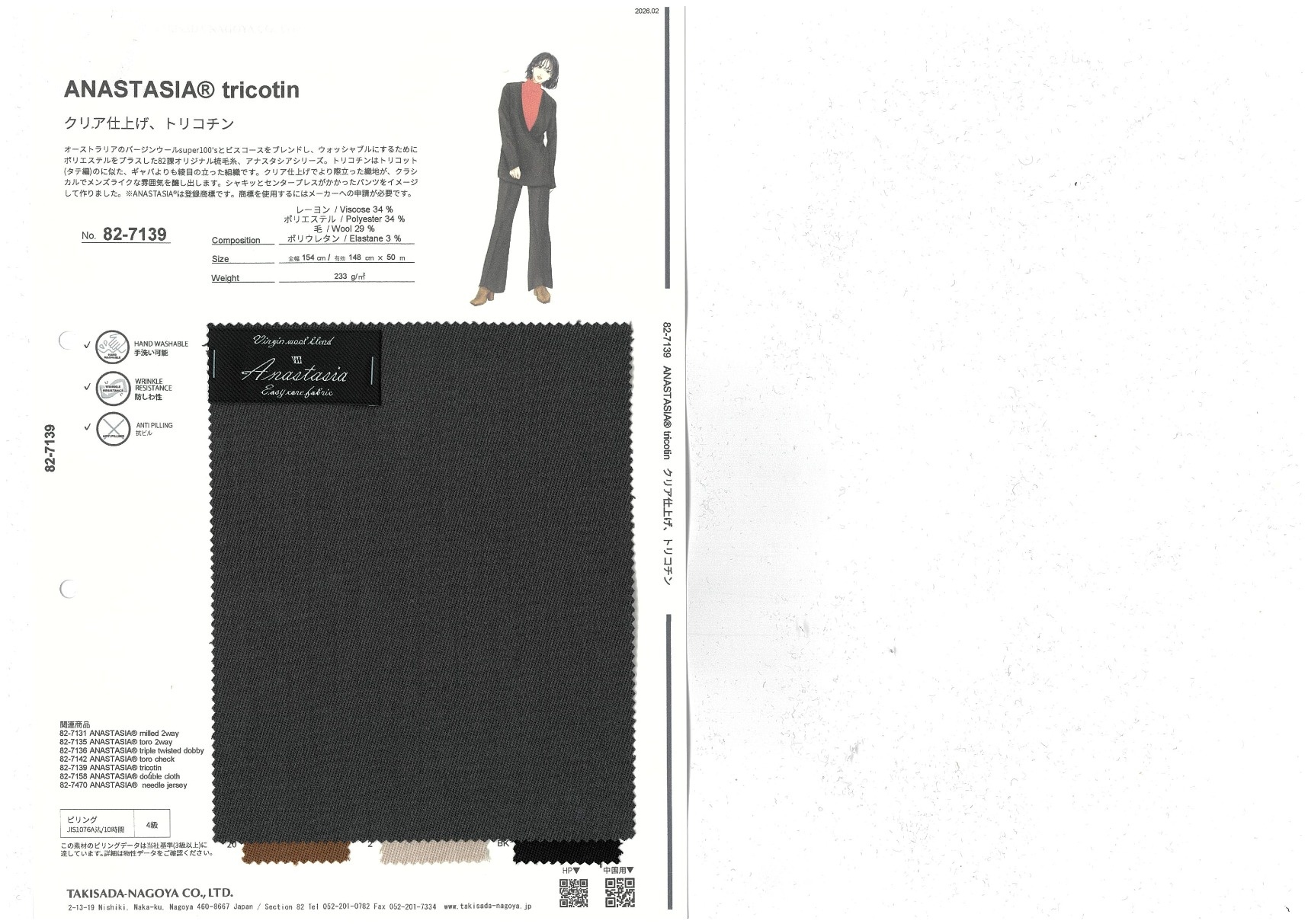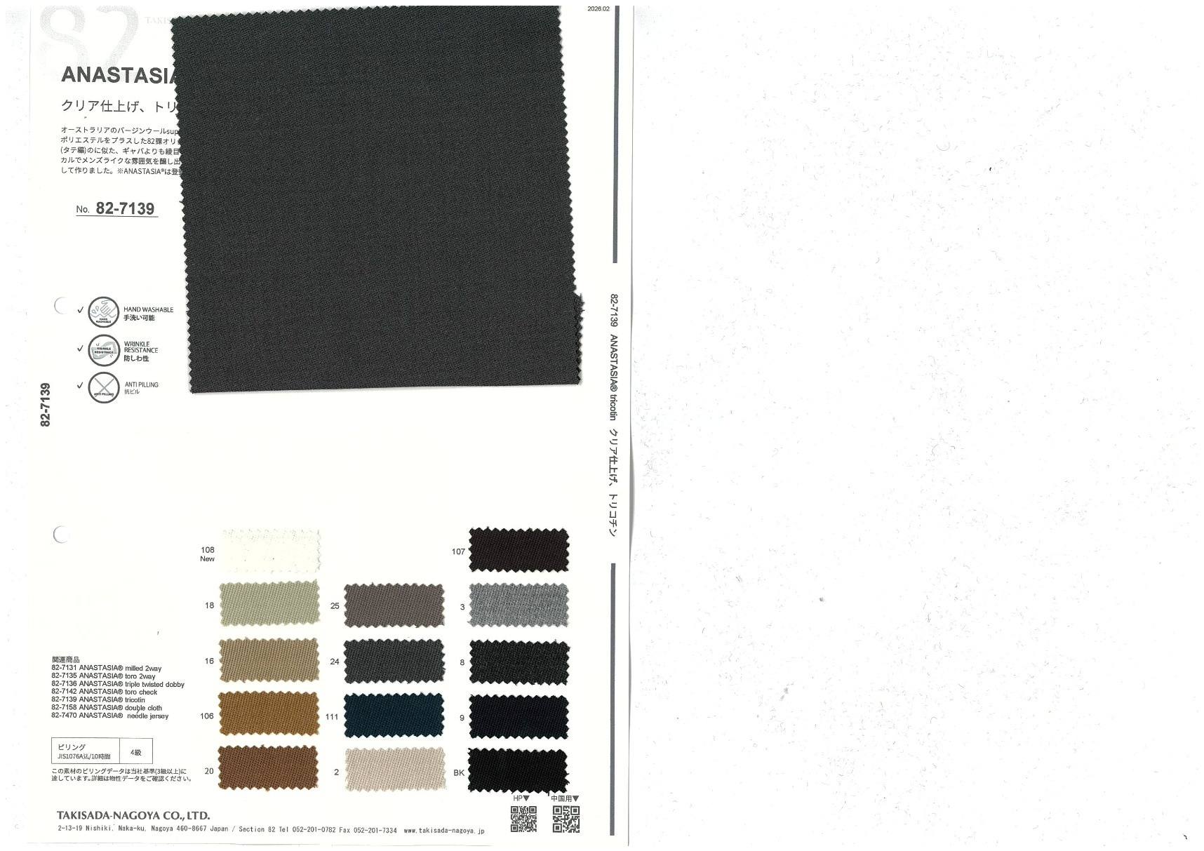 ANASTASIA tricotin 添加到收藏夹中 82-7139 面料、混率 Polyester 34% Rayon 34% Wool 29% Polyurethane 3% 规格、尺寸 148cm x 50m 预定停产商品 光洁加工、巧克丁 混纺产自澳大利亚的初剪羊毛和粘胶纤维,并加入涤纶以便可以水洗。巧克丁与经编织物类似,具有纹路比华达呢更为清晰的斜纹组织。通过光洁加工令面料更为出众,营造出古典与男性化的氛围。适用于笔直的中缝熨烫加工的裤子。 2026.02 放大的图像 色彩多样的放大图像 可持续的 回收 动物保护 可手洗 保温性能 接触冷感 吸汗速干 抗紫外线 抗皱 四门弹 防透光 抗沷水 日本产 意大利产 防风 抗菌防臭 抗病毒 吸湿发热 抗静电 除臭 抗起球 高弹性 吸光发热