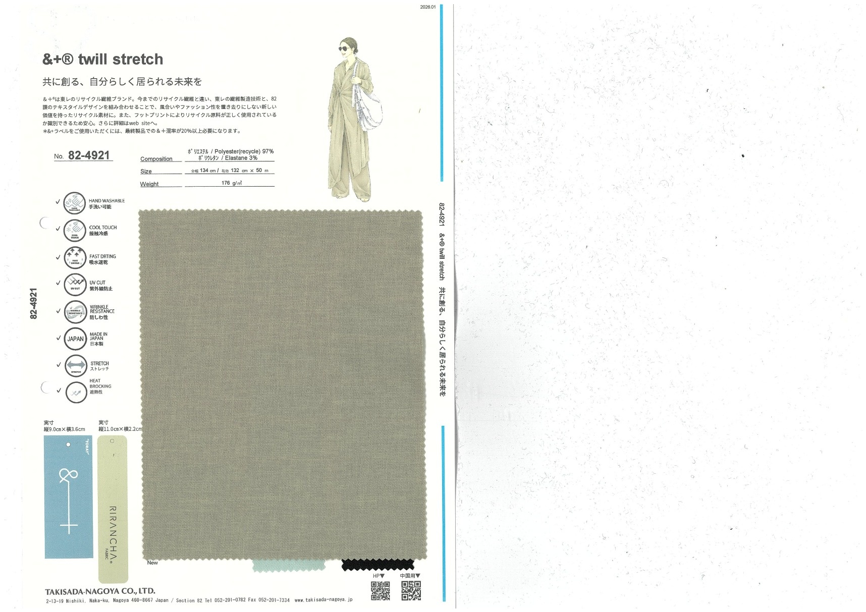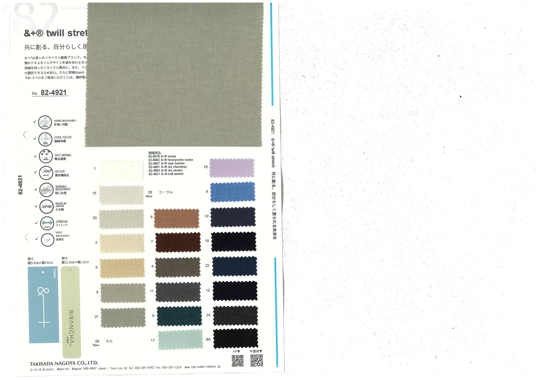 &+® twill stretch 添加到收藏夹中 82-4921 面料、混率 Polyurethane 3% 规格、尺寸 132cm x 50m 2026.01 放大的图像 色彩多样的放大图像 可持续的 回收 动物保护 可手洗 保温性能 接触冷感 吸汗速干 抗紫外线 抗皱 四门弹 防透光 抗沷水 日本产 意大利产 防风 抗菌防臭 抗病毒 吸湿发热 抗静电 除臭 抗起球 高弹性 吸光发热