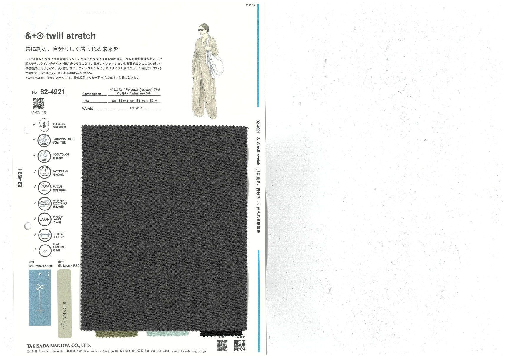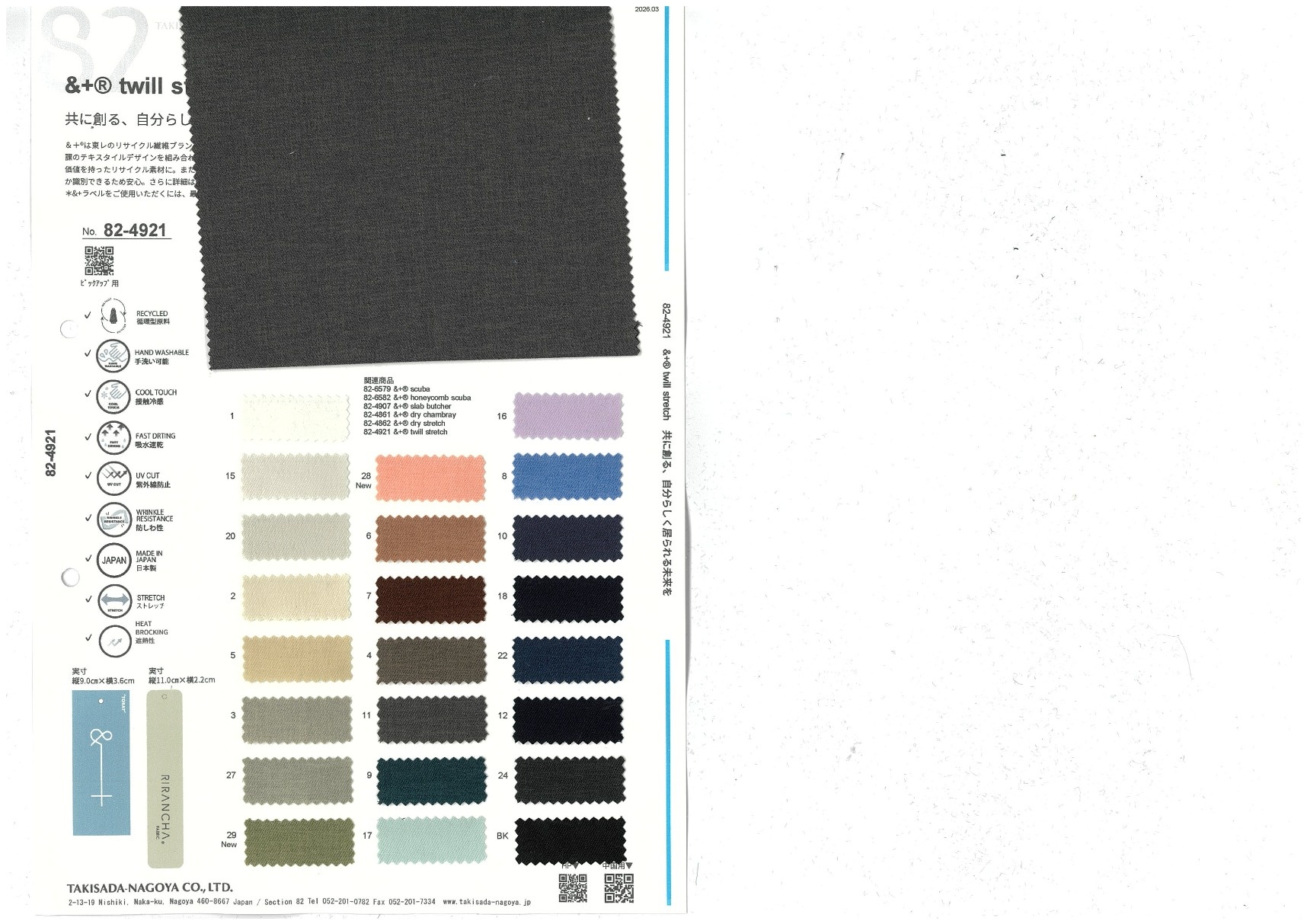 &+® twill stretch 添加到收藏夹中 82-4921 面料、混率 Polyurethane 3% 规格、尺寸 132cm x 50m 2026.03 放大的图像 色彩多样的放大图像 可持续的 回收 动物保护 可手洗 保温性能 接触冷感 吸汗速干 抗紫外线 抗皱 四门弹 防透光 抗沷水 日本产 意大利产 防风 抗菌防臭 抗病毒 吸湿发热 抗静电 除臭 抗起球 高弹性 吸光发热
