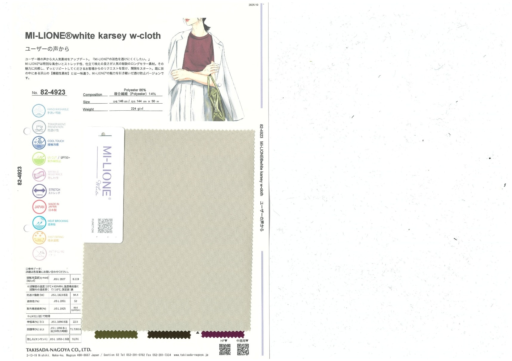 MI-LIONE®white karsey w-cloth 添加到收藏夹中 82-4923 面料、混率 Polyester 86% 规格、尺寸 140cm x 50m 预定停产商品 2025.10 放大的图像 色彩多样的放大图像 可持续的 回收 动物保护 可手洗 保温性能 接触冷感 吸汗速干 抗紫外线 抗皱 四门弹 防透光 抗沷水 日本产 意大利产 防风 抗菌防臭 抗病毒 吸湿发热 抗静电 除臭 抗起球 高弹性 吸光发热