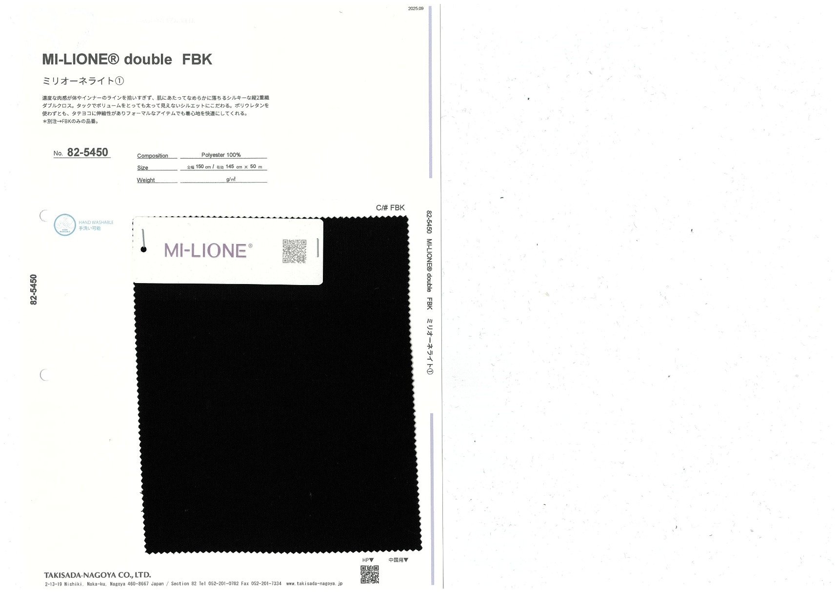 MI-LIONE® double FBK 添加到收藏夹中 82-5450 面料、混率 Polyester 100% 规格、尺寸 145cm x 50m 2025.09 放大的图像 可持续的 回收 动物保护 可手洗 保温性能 接触冷感 吸汗速干 抗紫外线 抗皱 四门弹 防透光 抗沷水 日本产 意大利产 防风 抗菌防臭 抗病毒 吸湿发热 抗静电 除臭 抗起球 高弹性 吸光发热