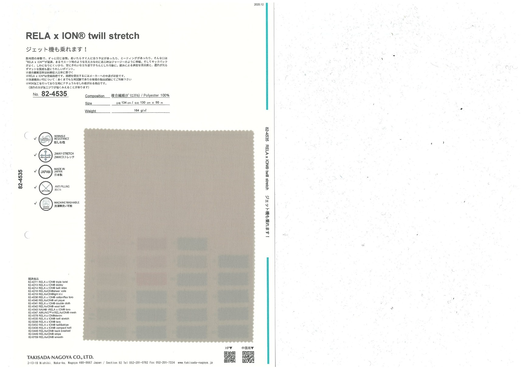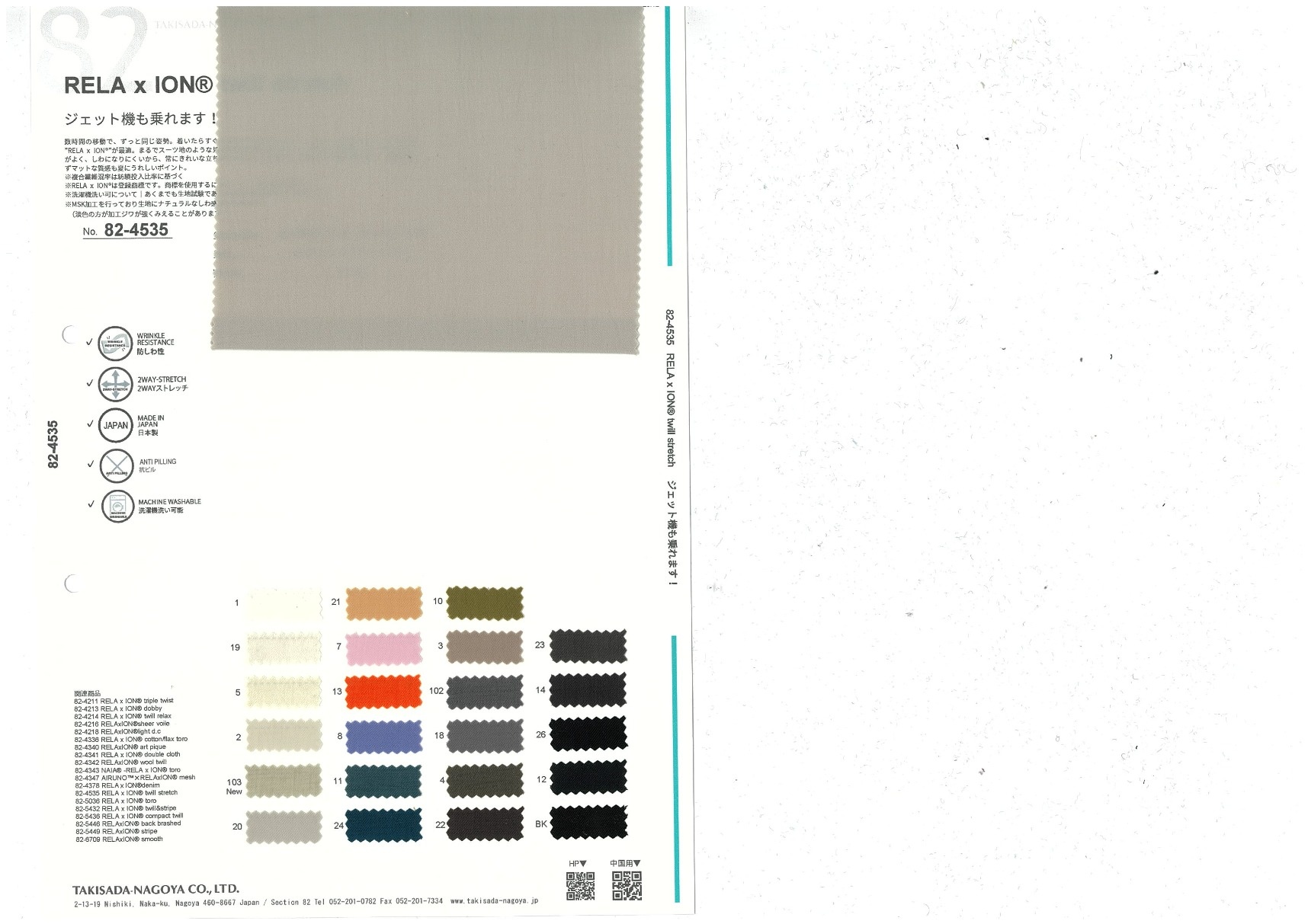 RELA×ION® twill stretch 添加到收藏夹中 82-4535 面料、混率 规格、尺寸 130cm x 50m 2025.12 放大的图像 色彩多样的放大图像 可持续的 回收 动物保护 可手洗 保温性能 接触冷感 吸汗速干 抗紫外线 抗皱 四门弹 防透光 抗沷水 日本产 意大利产 防风 抗菌防臭 抗病毒 吸湿发热 抗静电 除臭 抗起球 高弹性 吸光发热