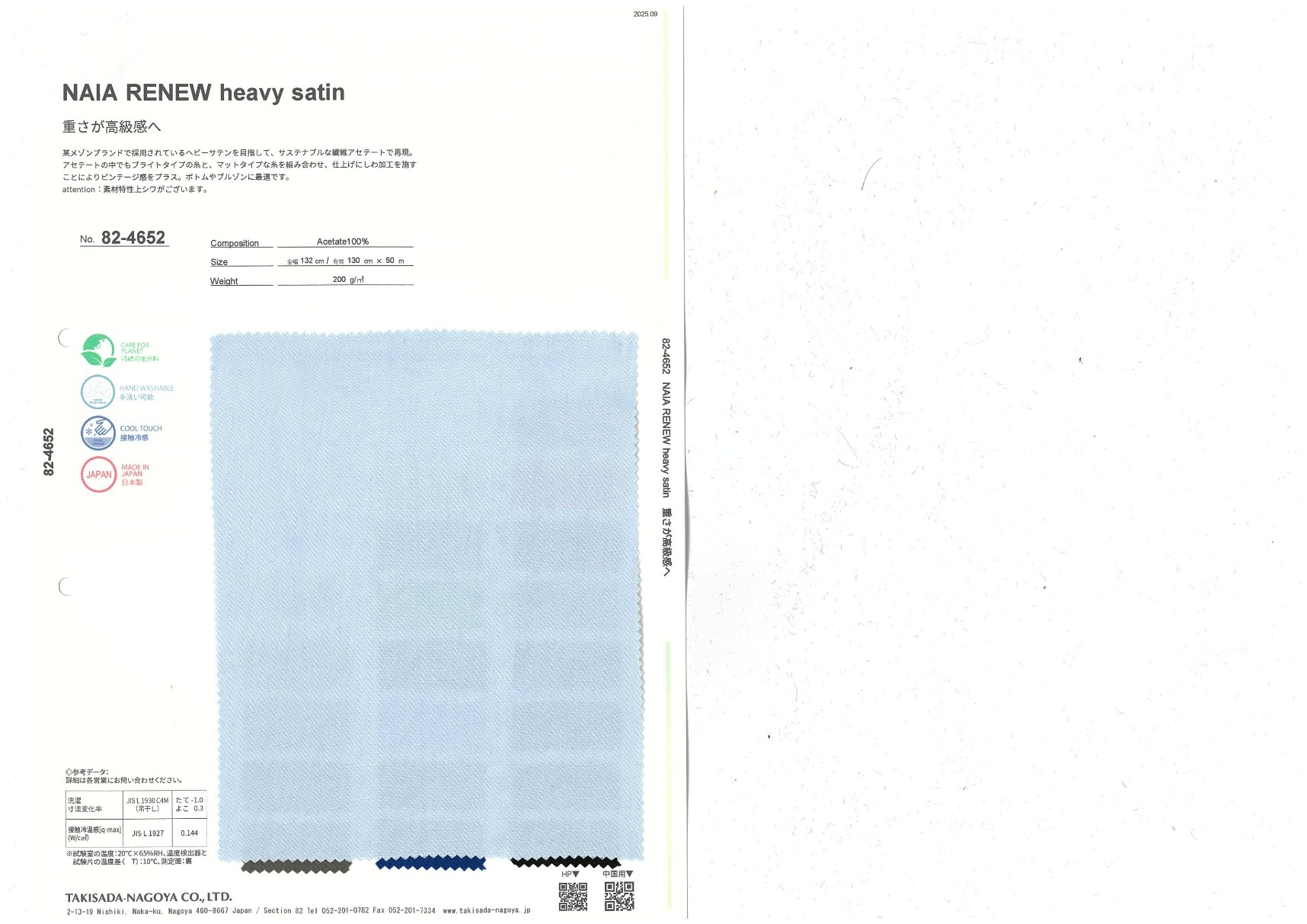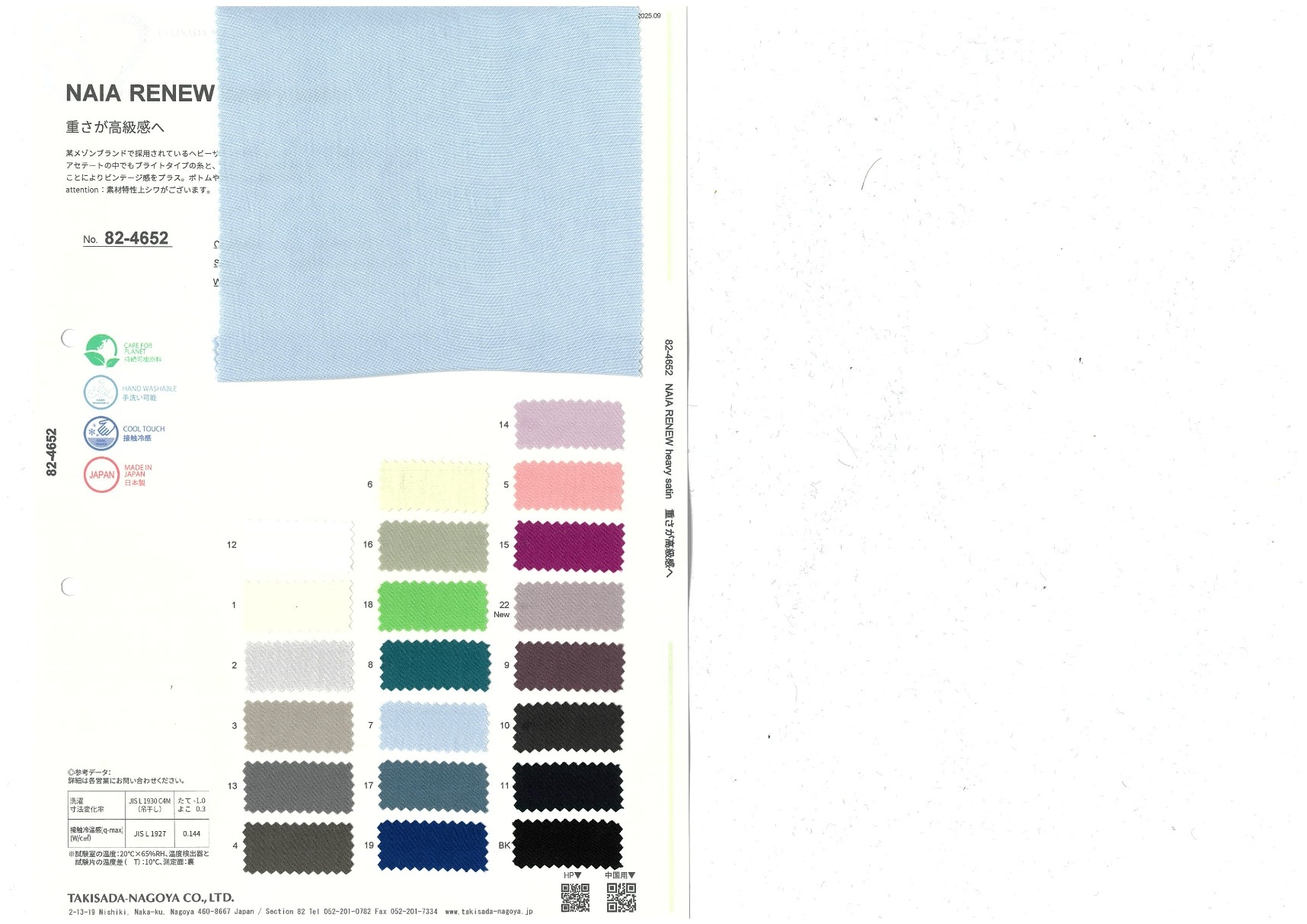 NAIA RENEW heavy satin 添加到收藏夹中 82-4652 面料、混率 规格、尺寸 130cm x 50m 2025.09 放大的图像 色彩多样的放大图像 可持续的 回收 动物保护 可手洗 保温性能 接触冷感 吸汗速干 抗紫外线 抗皱 四门弹 防透光 抗沷水 日本产 意大利产 防风 抗菌防臭 抗病毒 吸湿发热 抗静电 除臭 抗起球 高弹性 吸光发热
