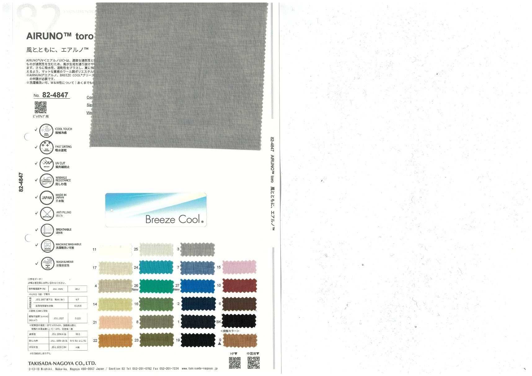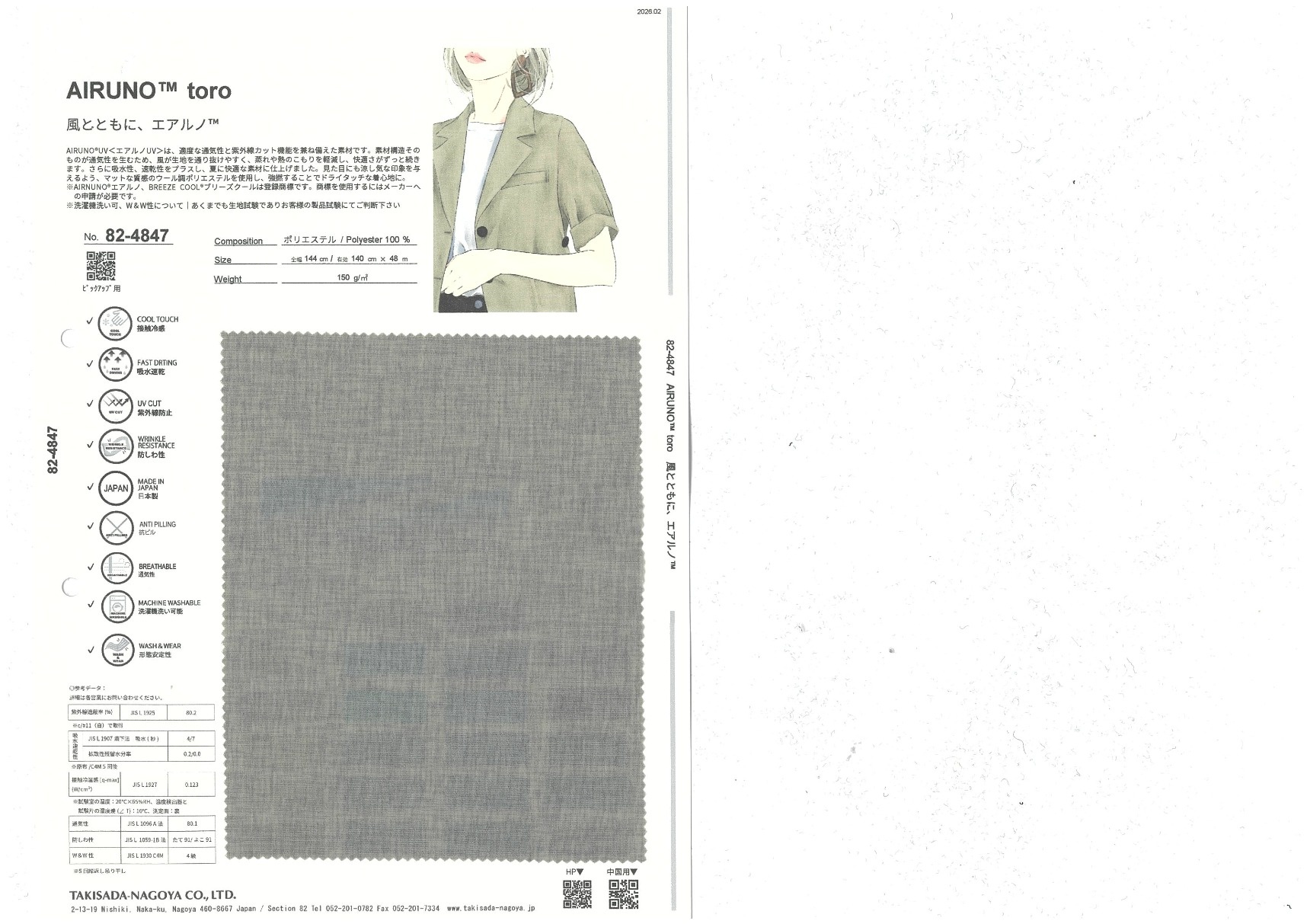 AIRUNO™ toro 添加到收藏夹中 82-4847 面料、混率 Polyester 100% 规格、尺寸 140cm x 48m 2026.02 放大的图像 色彩多样的放大图像 可持续的 回收 动物保护 可手洗 保温性能 接触冷感 吸汗速干 抗紫外线 抗皱 四门弹 防透光 抗沷水 日本产 意大利产 防风 抗菌防臭 抗病毒 吸湿发热 抗静电 除臭 抗起球 高弹性 吸光发热