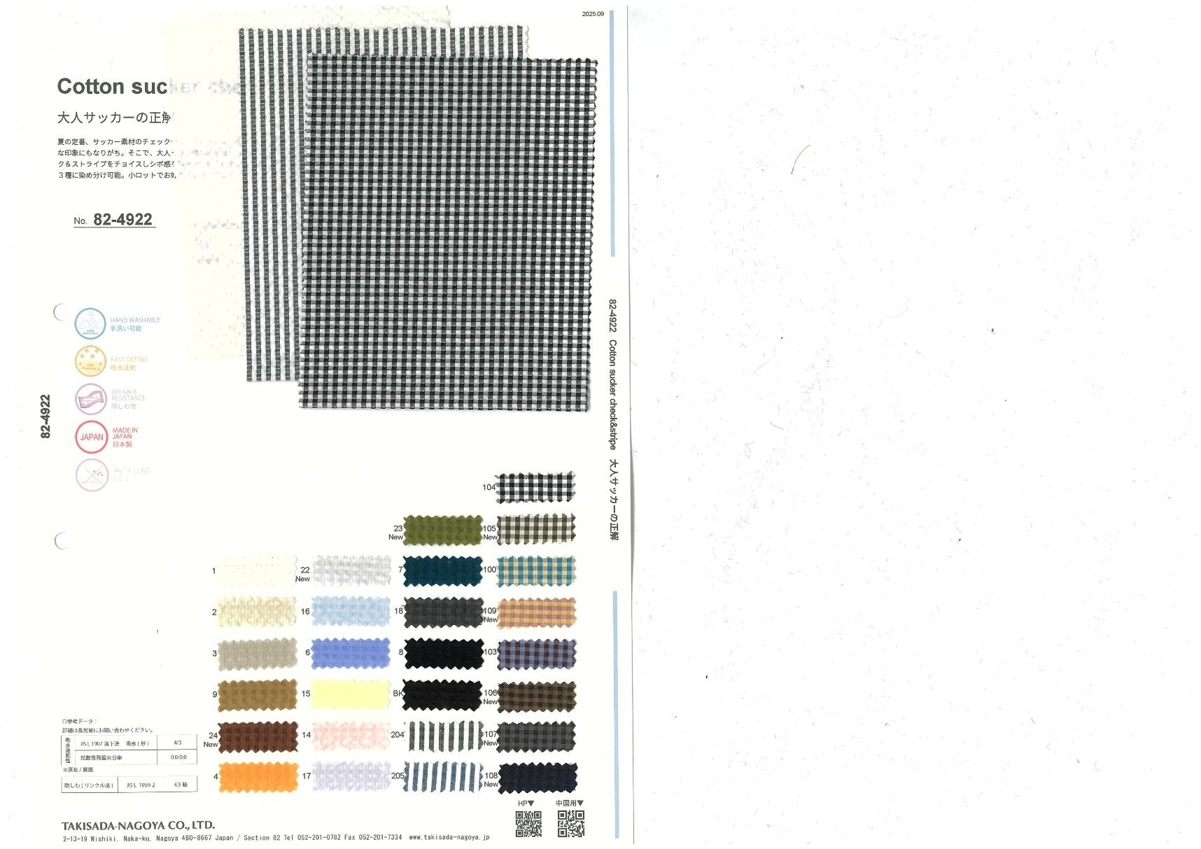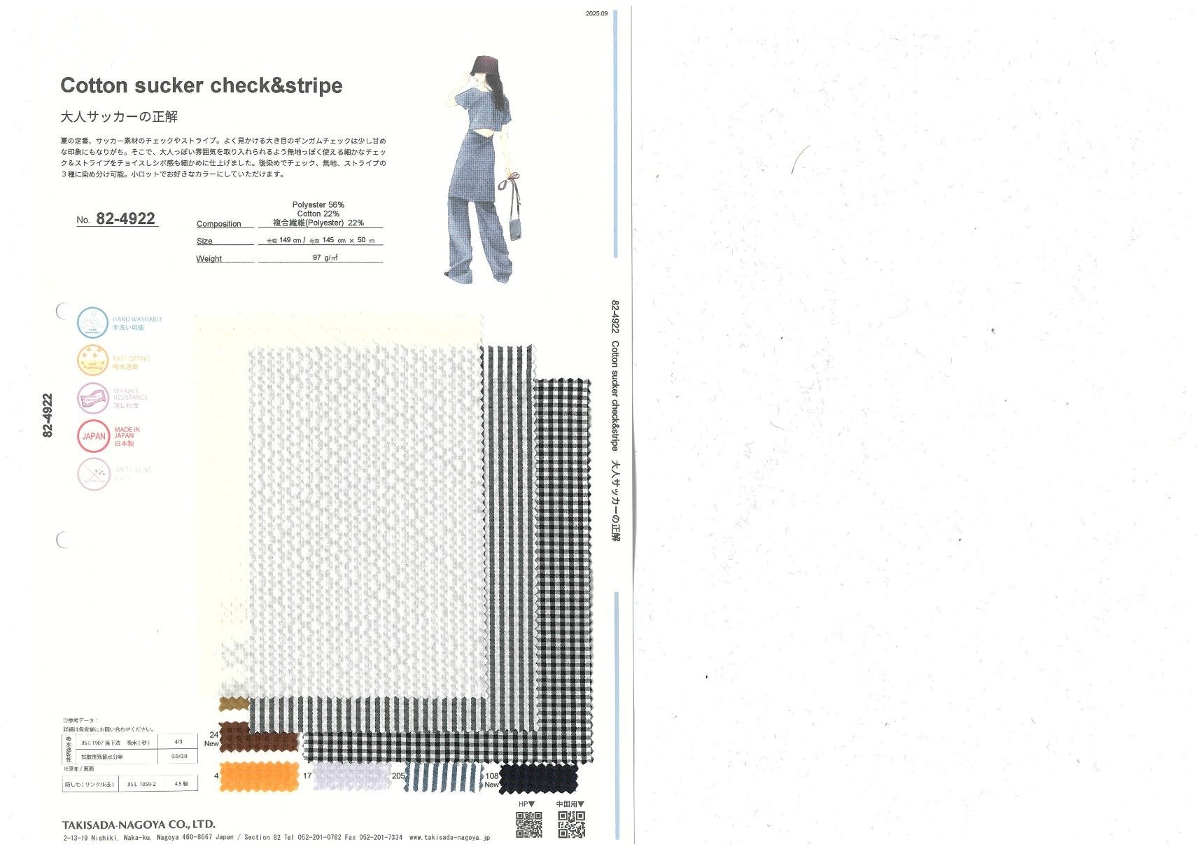 Cotton sucker check&stripe 添加到收藏夹中 82-4922 面料、混率 Polyester 56% Cotton 22% 规格、尺寸 145cm x 50m 2025.09 放大的图像 色彩多样的放大图像 可持续的 回收 动物保护 可手洗 保温性能 接触冷感 吸汗速干 抗紫外线 抗皱 四门弹 防透光 抗沷水 日本产 意大利产 防风 抗菌防臭 抗病毒 吸湿发热 抗静电 除臭 抗起球 高弹性 吸光发热
