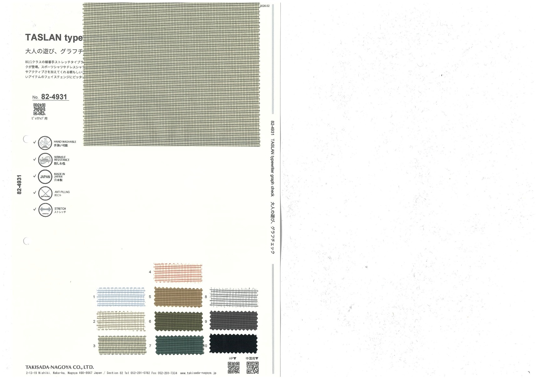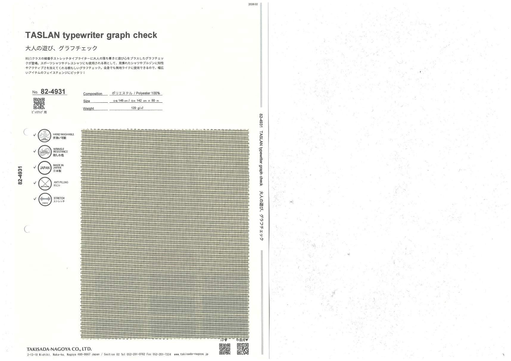 TASLAN typewriter graph check 添加到收藏夹中 82-4931 面料、混率 Polyester 100% 规格、尺寸 142cm x 50m 预定停产商品 2026.02 放大的图像 色彩多样的放大图像 可持续的 回收 动物保护 可手洗 保温性能 接触冷感 吸汗速干 抗紫外线 抗皱 四门弹 防透光 抗沷水 日本产 意大利产 防风 抗菌防臭 抗病毒 吸湿发热 抗静电 除臭 抗起球 高弹性 吸光发热