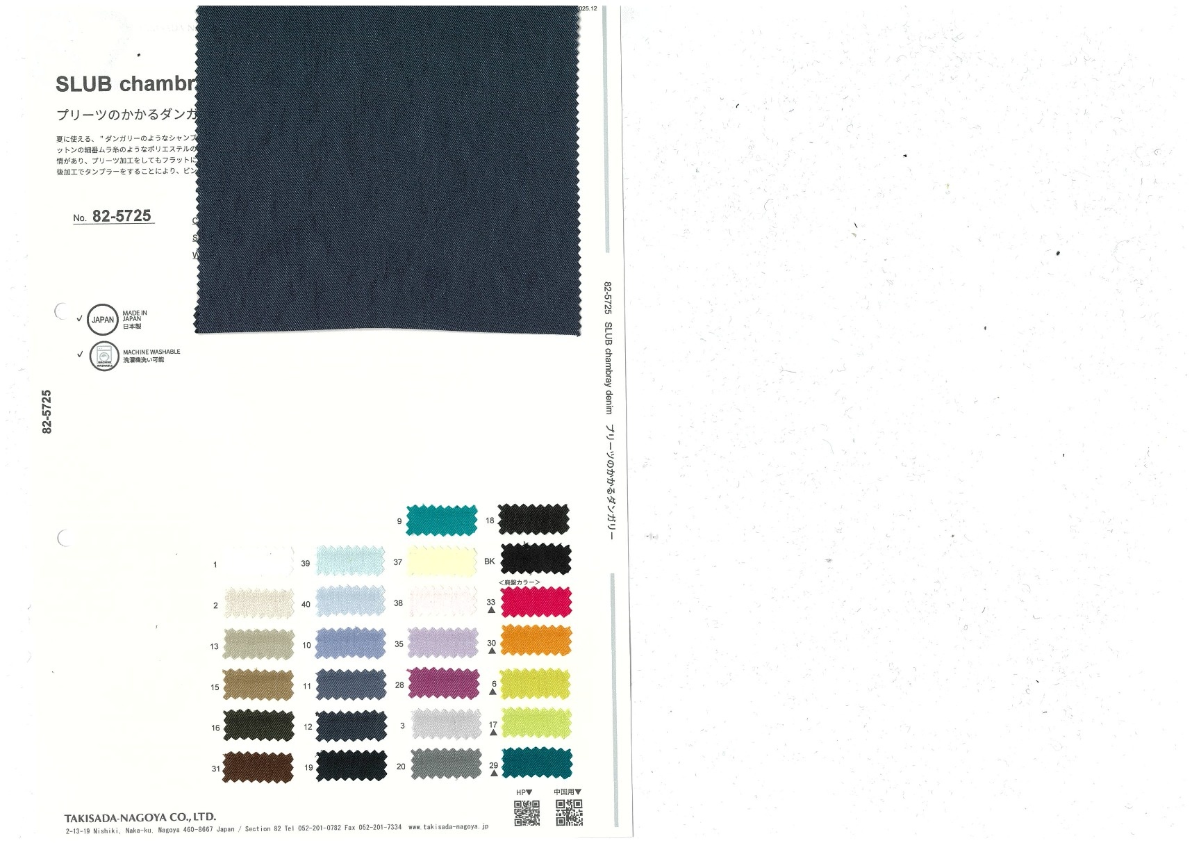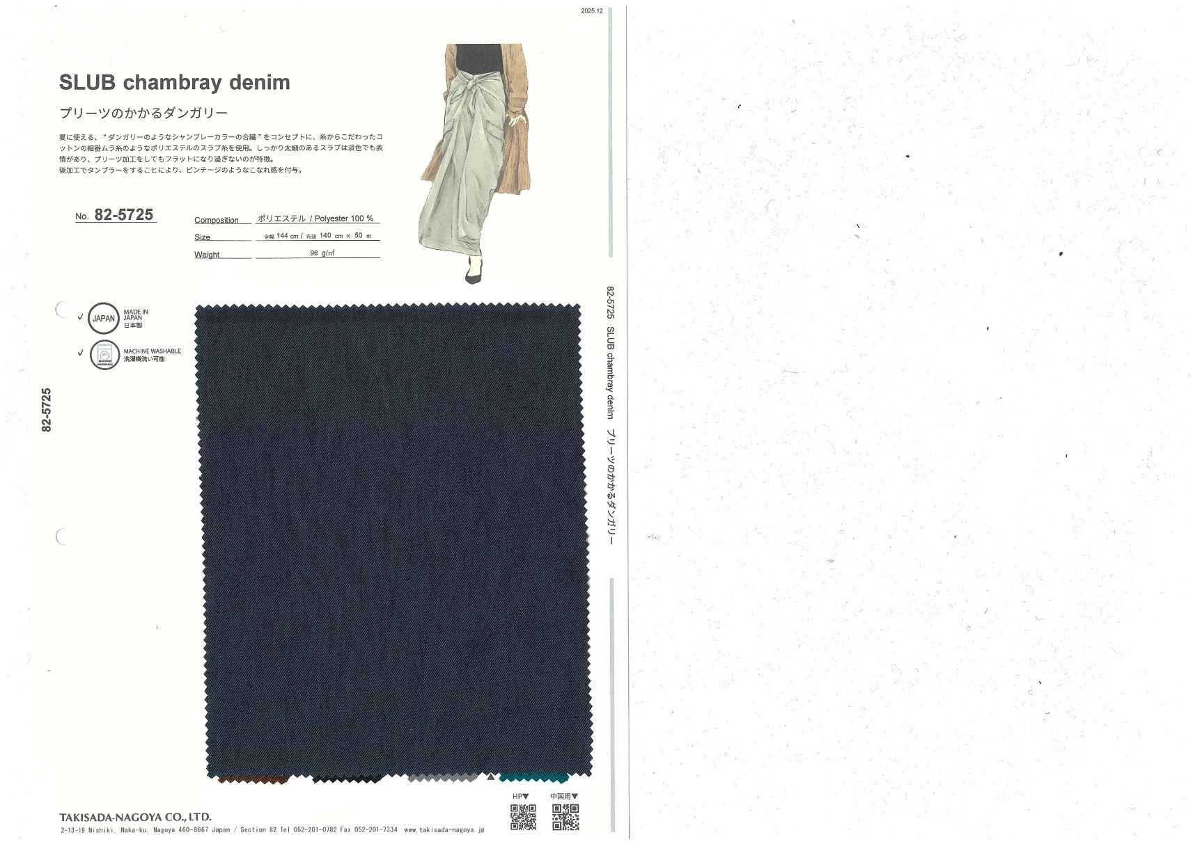 NATURAL chambray twill 添加到收藏夹中 82-5725 面料、混率 Polyester 100% 规格、尺寸 140cm x 50m 注意 ※可施以压绉加工 ※基于面料特性,可能有卷边。因此设计时请考虑这一因素。 施以压绉加工的斜纹劳动布 以可用于夏季服装,如斜纹劳动布般呈现青年布颜色的合成纤维为概念,使用从纱线阶段就开始讲究的如粗细不匀的细支棉线般的涤纶竹节纱。粗细明显的竹节纱即使浅色也富有特色,具有纵使施以压绉加工也不会令人觉得过于板正的特点。通过滚筒烘干的后续加工处理,面料给人一种复古的脱俗感。 2025.12 放大的图像 色彩多样的放大图像 可持续的 回收 动物保护 可手洗 保温性能 接触冷感 吸汗速干 抗紫外线 抗皱 四门弹 防透光 抗沷水 日本产 意大利产 防风 抗菌防臭 抗病毒 吸湿发热 抗静电 除臭 抗起球 高弹性 吸光发热