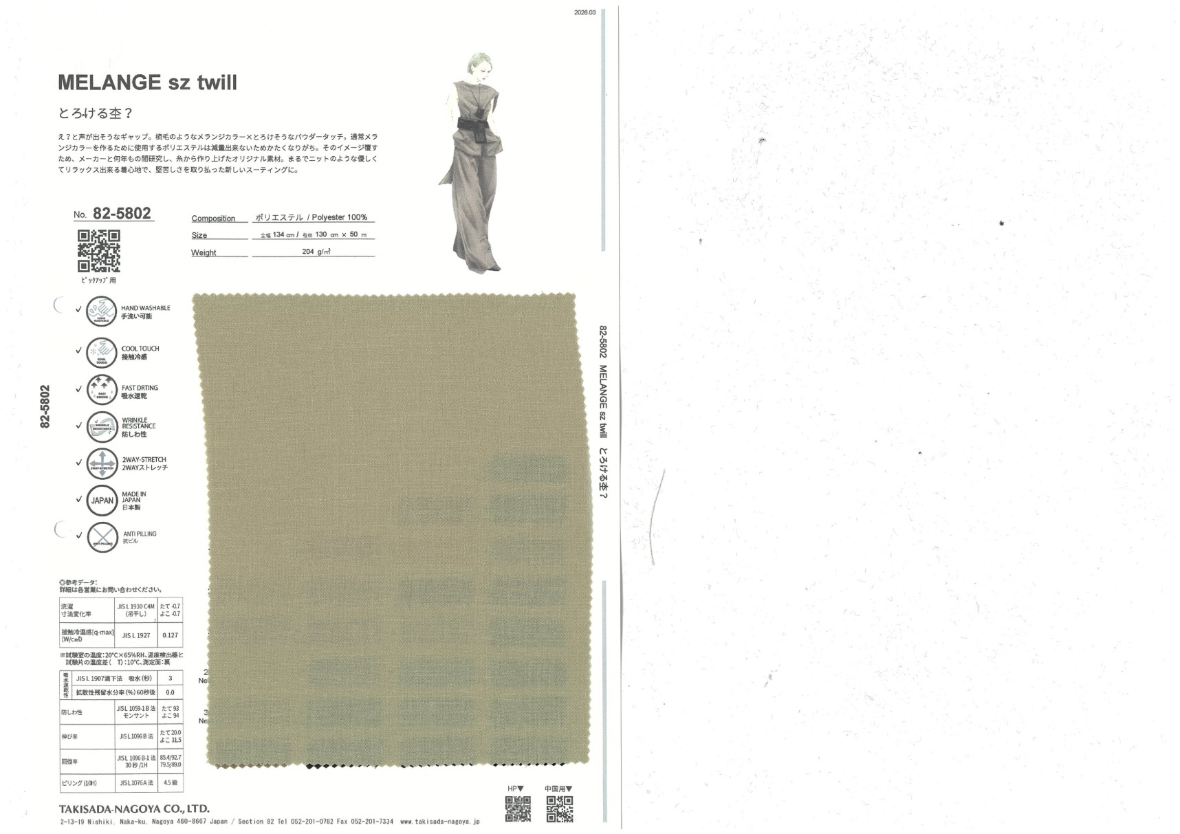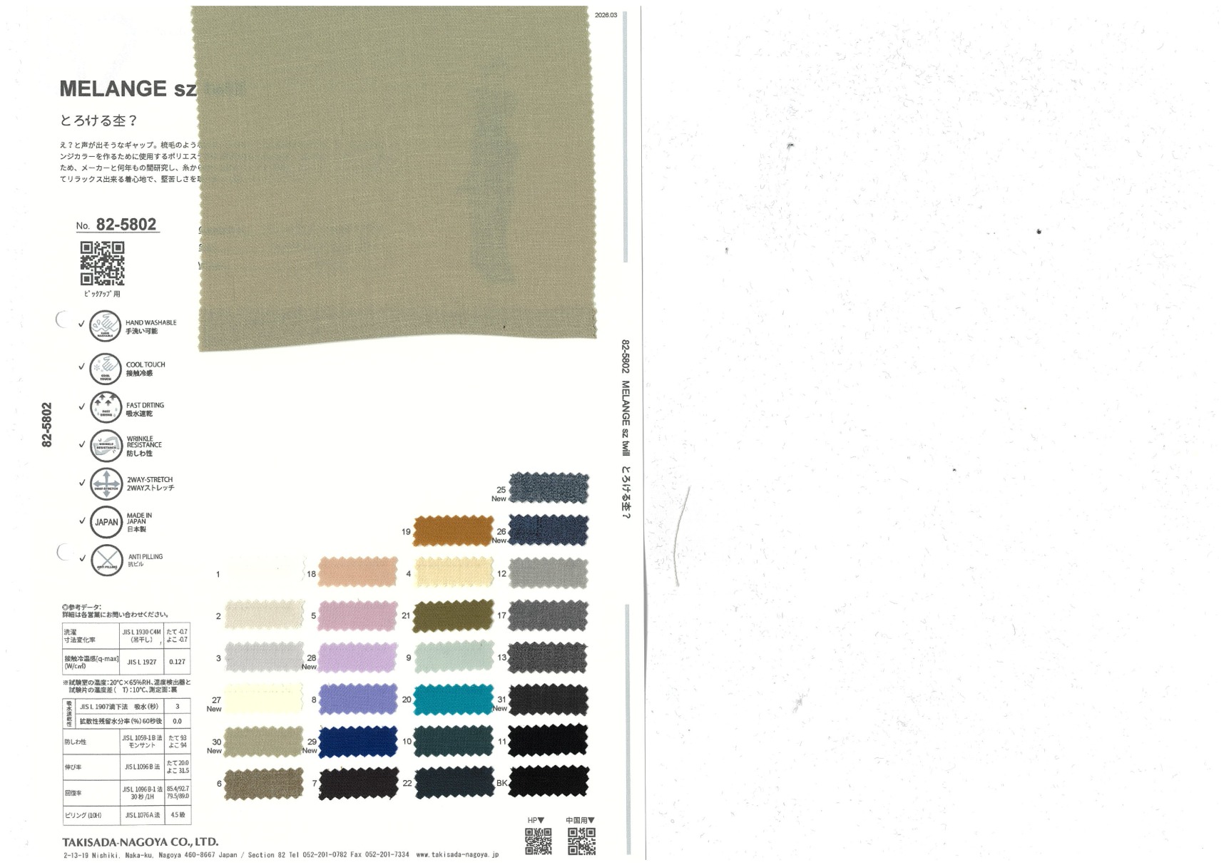 MELANGE sz twill 添加到收藏夹中 82-5802 面料、混率 Polyester 100% 规格、尺寸 130cm x 50m 2026.03 放大的图像 色彩多样的放大图像 可持续的 回收 动物保护 可手洗 保温性能 接触冷感 吸汗速干 抗紫外线 抗皱 四门弹 防透光 抗沷水 日本产 意大利产 防风 抗菌防臭 抗病毒 吸湿发热 抗静电 除臭 抗起球 高弹性 吸光发热