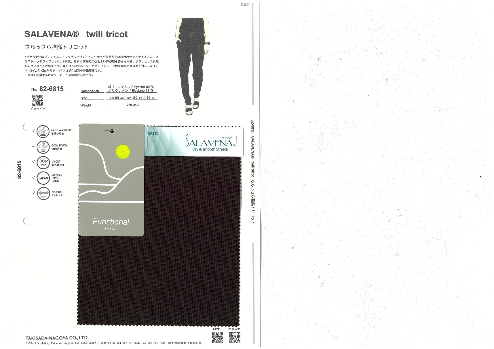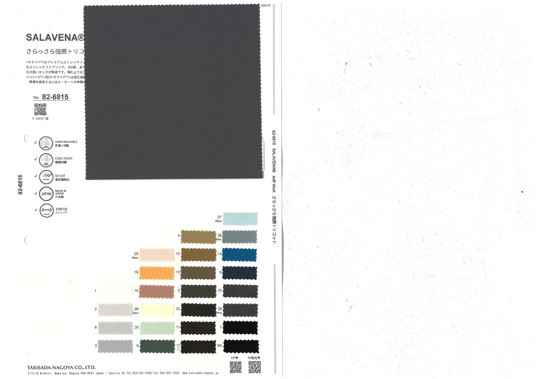 SALAVENA® twill tricot 添加到收藏夹中 82-6815 面料、混率 Polyester 89% Polyurethane 11% 规格、尺寸 150cm x 50m 2026.03 放大的图像 色彩多样的放大图像 可持续的 回收 动物保护 可手洗 保温性能 接触冷感 吸汗速干 抗紫外线 抗皱 四门弹 防透光 抗沷水 日本产 意大利产 防风 抗菌防臭 抗病毒 吸湿发热 抗静电 除臭 抗起球 高弹性 吸光发热