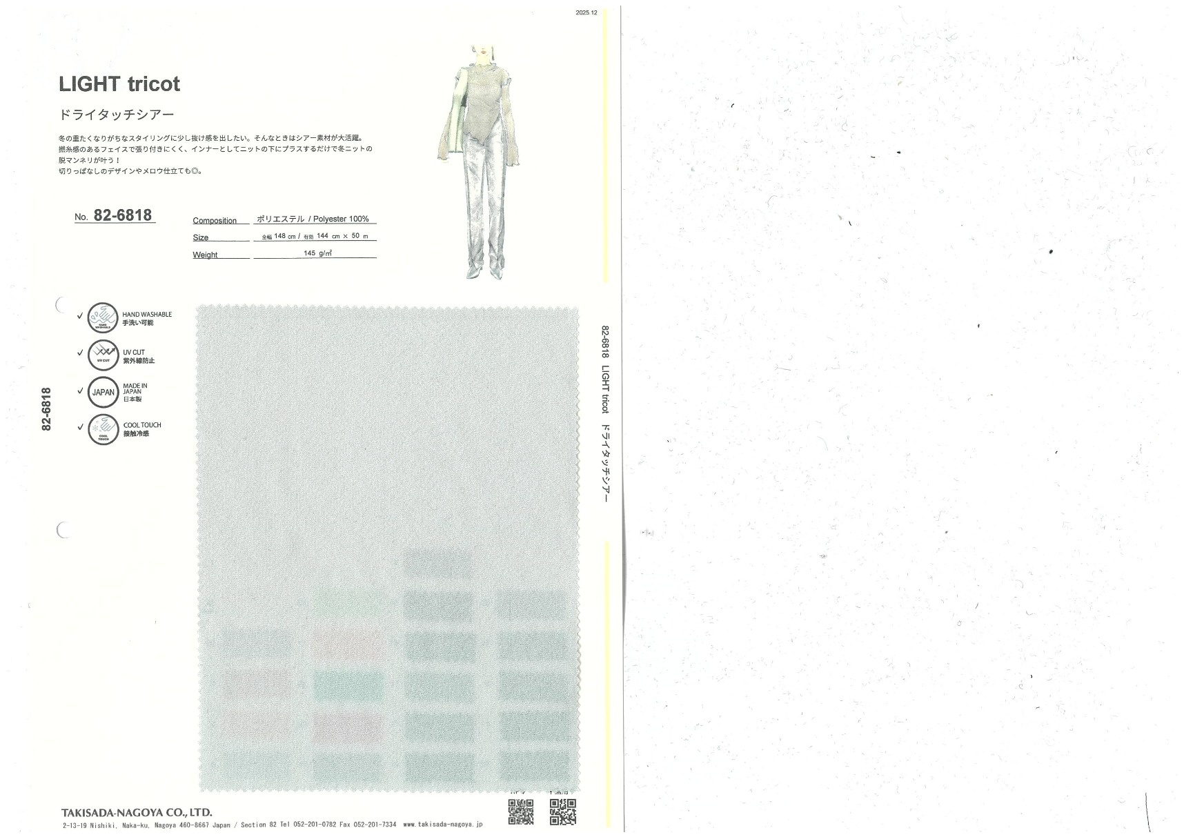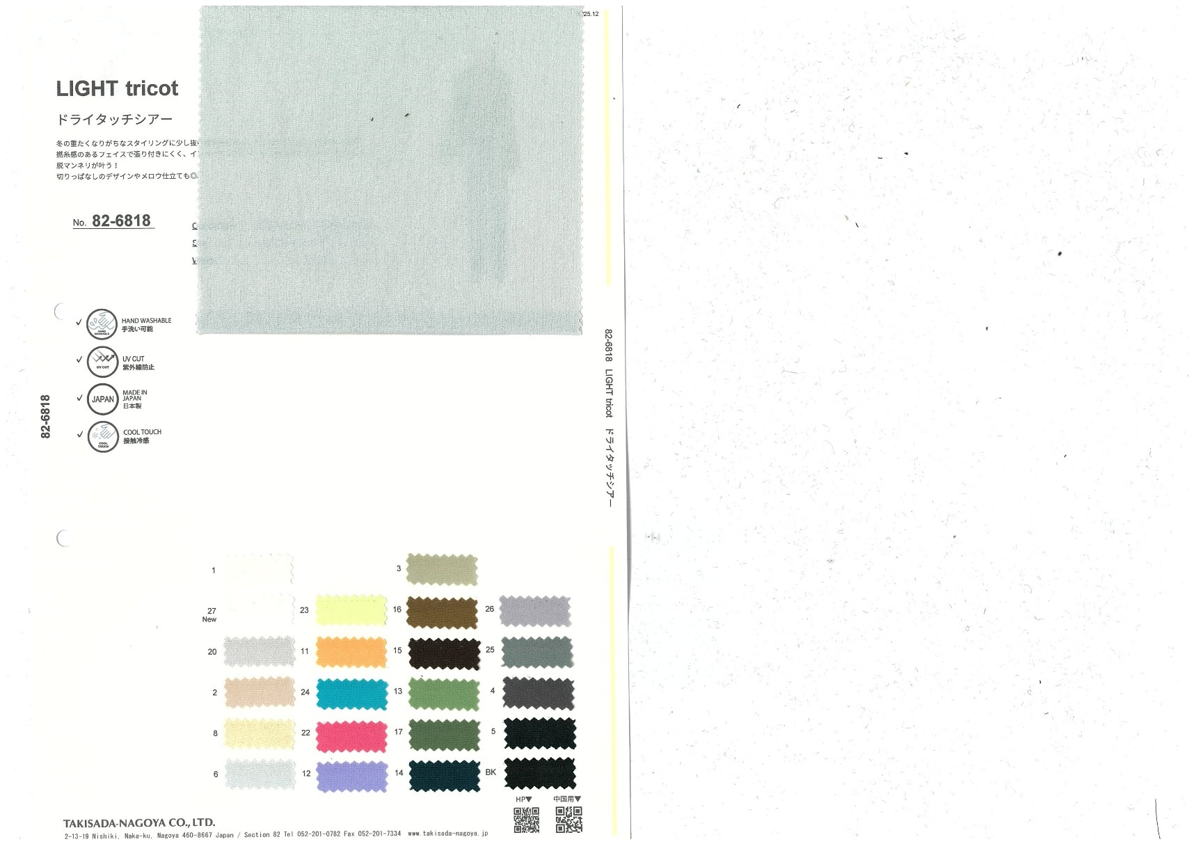 LIGHT tricot 添加到收藏夹中 82-6818 面料、混率 Polyester 100% 规格、尺寸 144cm x 50m 2025.12 放大的图像 色彩多样的放大图像 可持续的 回收 动物保护 可手洗 保温性能 接触冷感 吸汗速干 抗紫外线 抗皱 四门弹 防透光 抗沷水 日本产 意大利产 防风 抗菌防臭 抗病毒 吸湿发热 抗静电 除臭 抗起球 高弹性 吸光发热