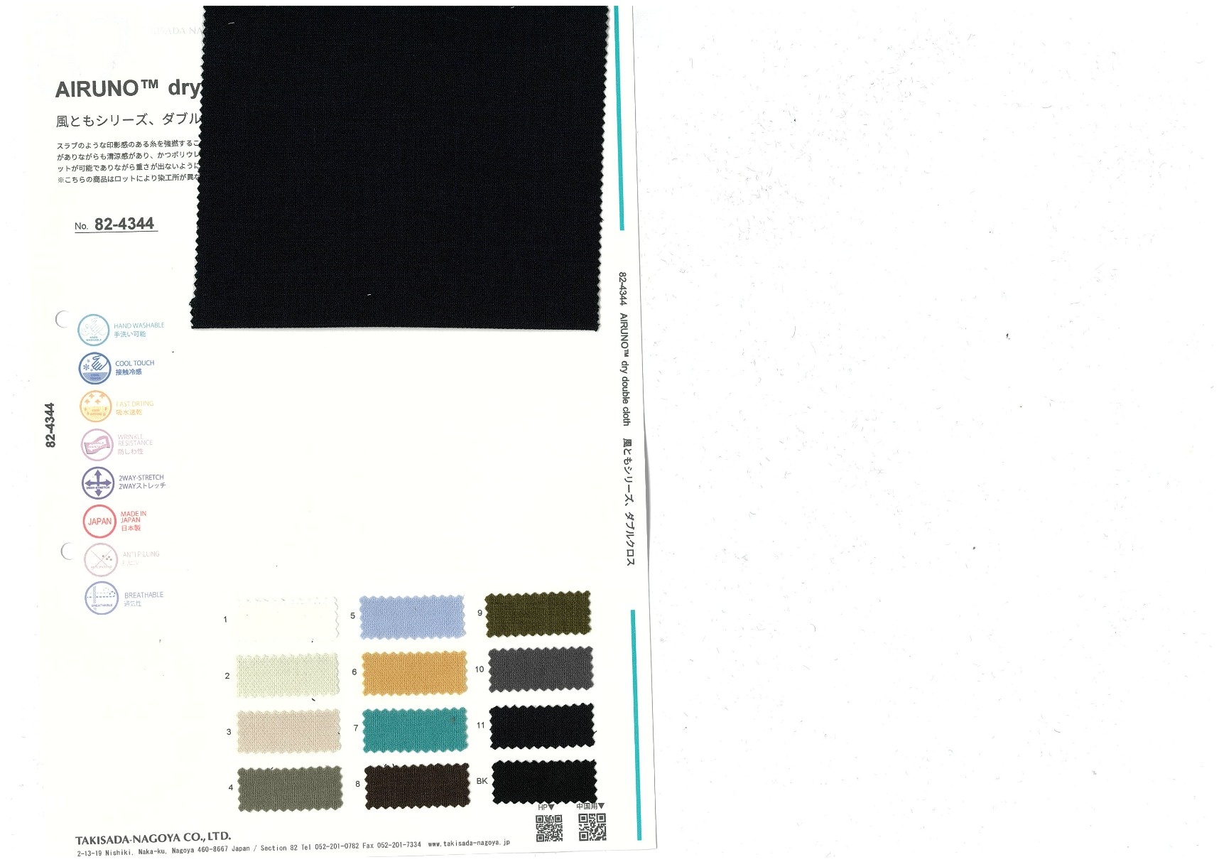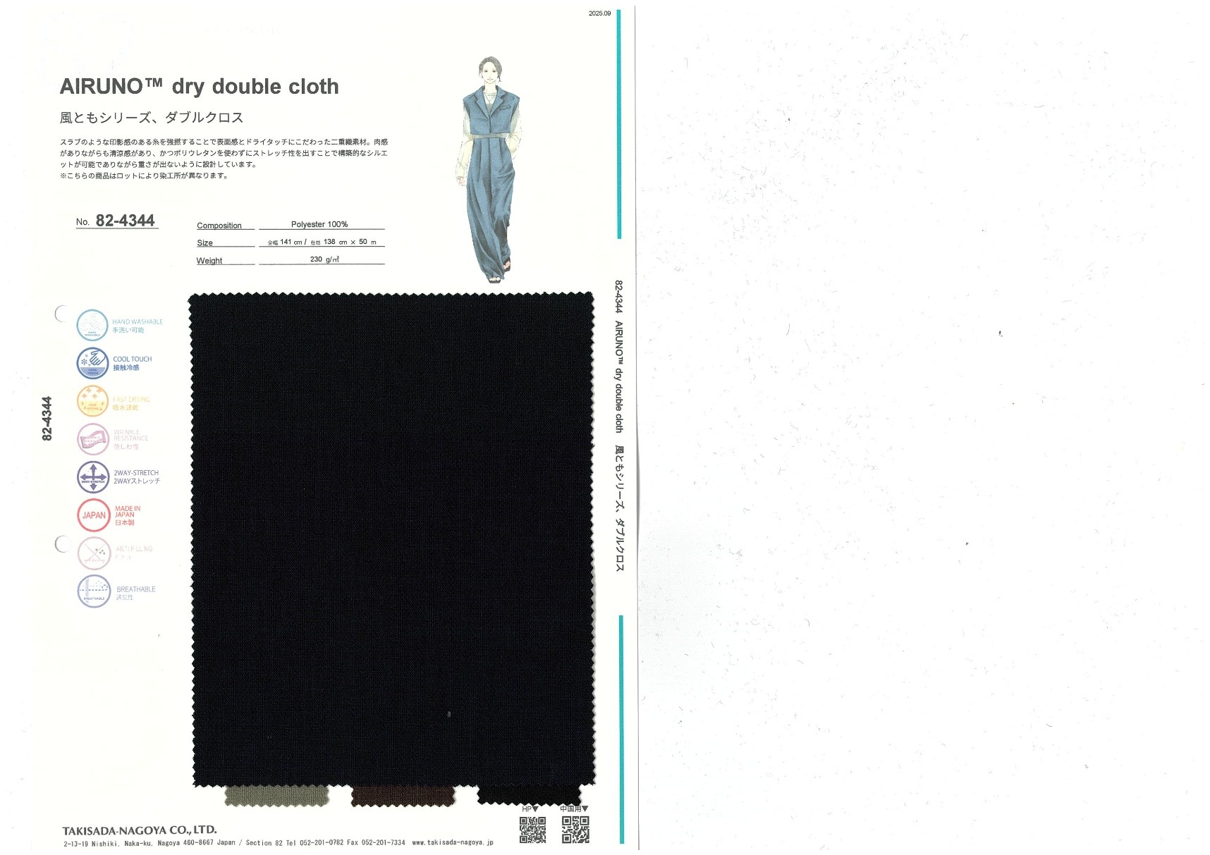 RELAxION® dry double cloth 添加到收藏夹中 82-4344 面料、混率 Polyester 100% 规格、尺寸 138cm x 50m 2025.09 放大的图像 色彩多样的放大图像 可持续的 回收 动物保护 可手洗 保温性能 接触冷感 吸汗速干 抗紫外线 抗皱 四门弹 防透光 抗沷水 日本产 意大利产 防风 抗菌防臭 抗病毒 吸湿发热 抗静电 除臭 抗起球 高弹性 吸光发热