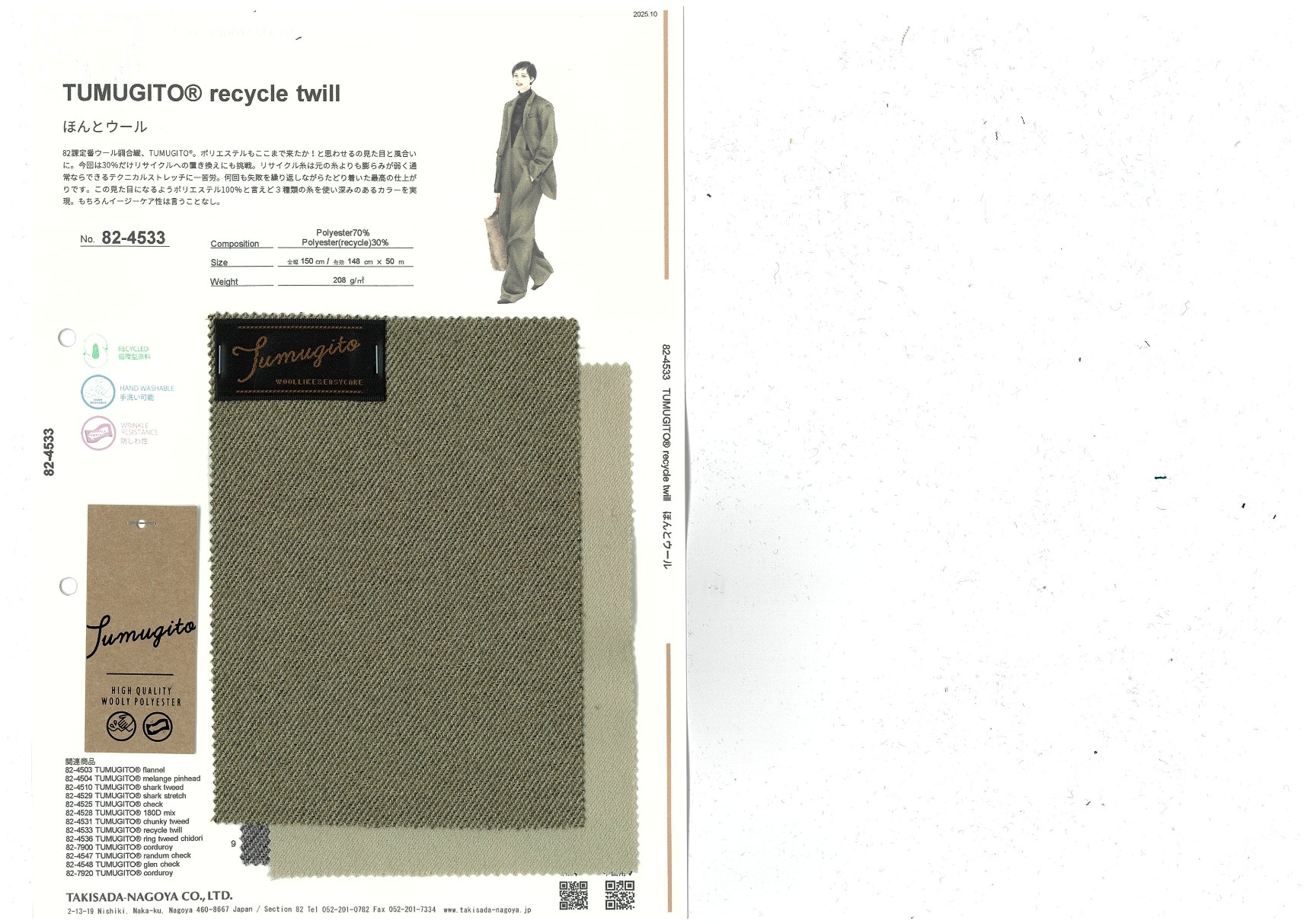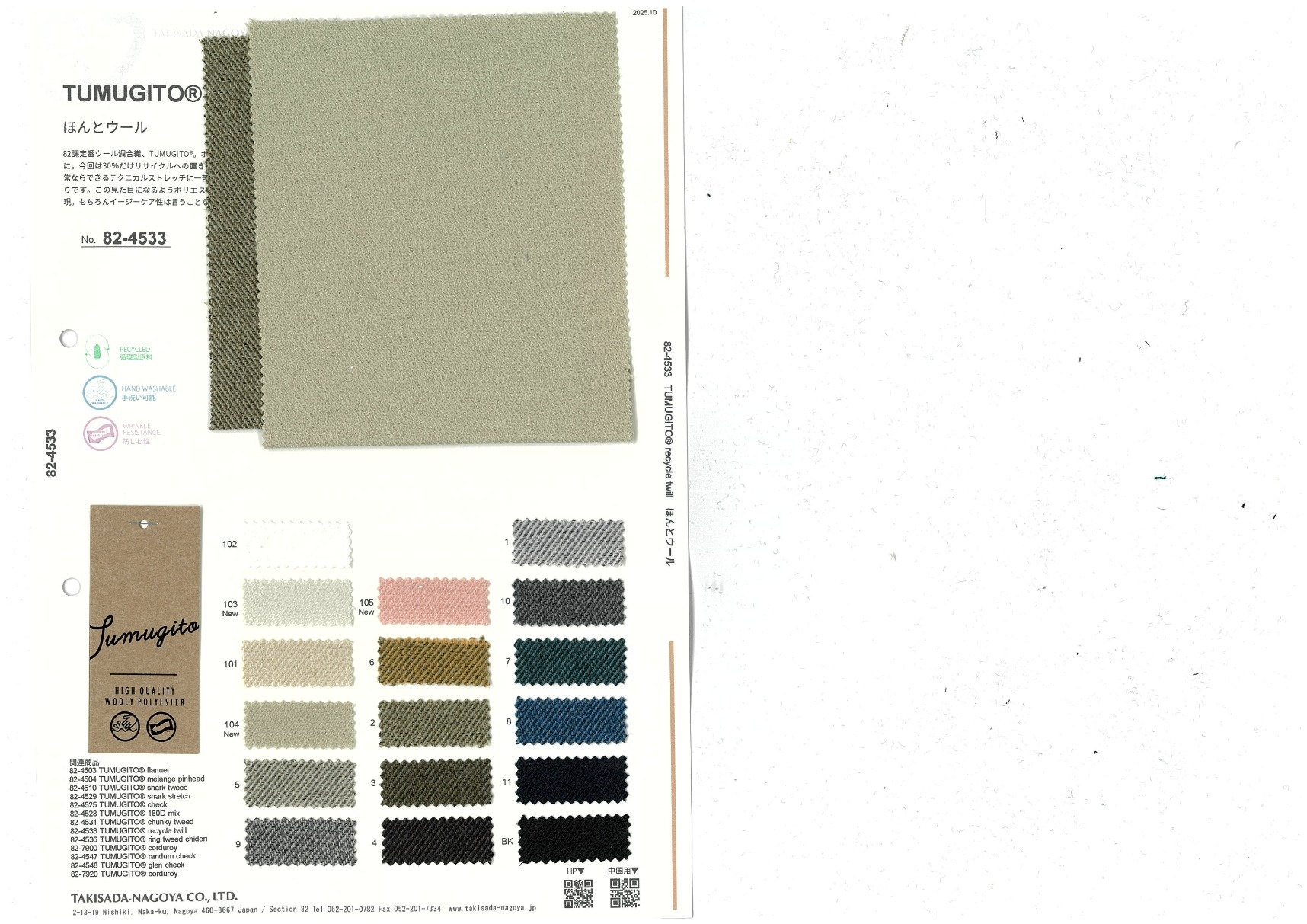 TUMUGITO® recycle twill 添加到收藏夹中 82-4533 面料、混率 Polyester 70% 规格、尺寸 148cm x 50m 2025.10 放大的图像 色彩多样的放大图像 可持续的 回收 动物保护 可手洗 保温性能 接触冷感 吸汗速干 抗紫外线 抗皱 四门弹 防透光 抗沷水 日本产 意大利产 防风 抗菌防臭 抗病毒 吸湿发热 抗静电 除臭 抗起球 高弹性 吸光发热