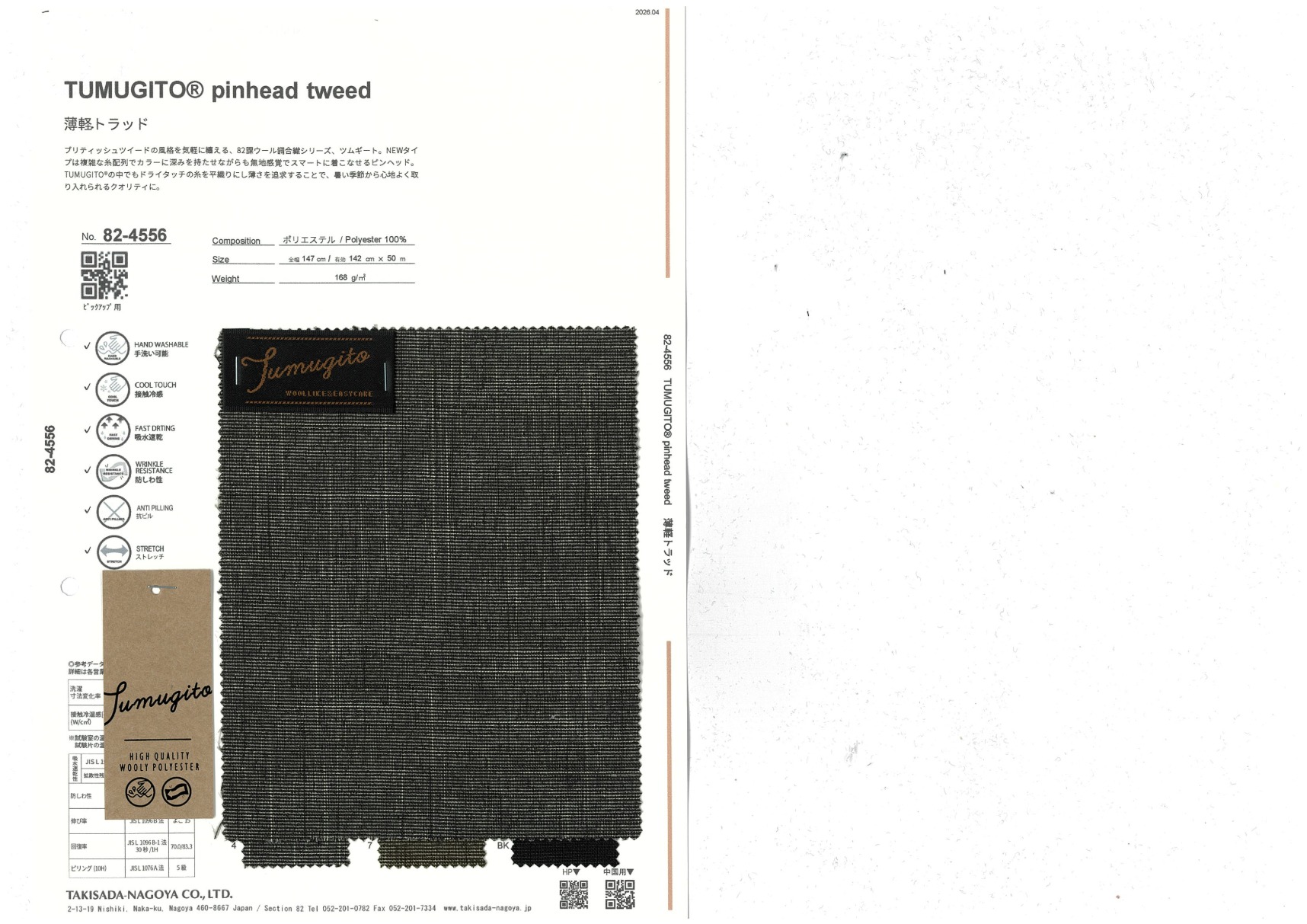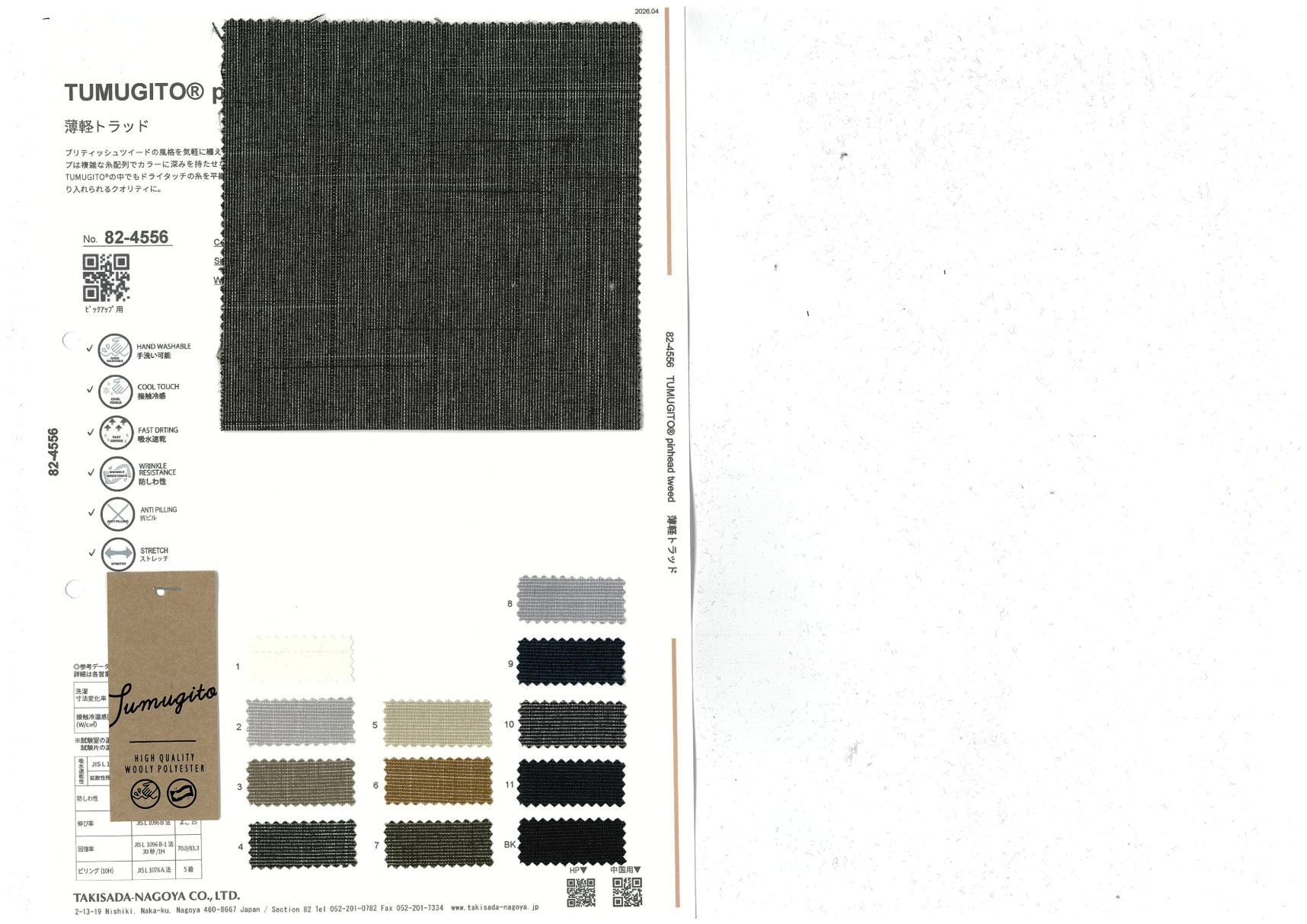 TUMUGITO® pinhead tweed 添加到收藏夹中 82-4556 面料、混率 Polyester 100% 规格、尺寸 142cm x 50m 2026.03 放大的图像 色彩多样的放大图像 可持续的 回收 动物保护 可手洗 保温性能 接触冷感 吸汗速干 抗紫外线 抗皱 四门弹 防透光 抗沷水 日本产 意大利产 防风 抗菌防臭 抗病毒 吸湿发热 抗静电 除臭 抗起球 高弹性 吸光发热