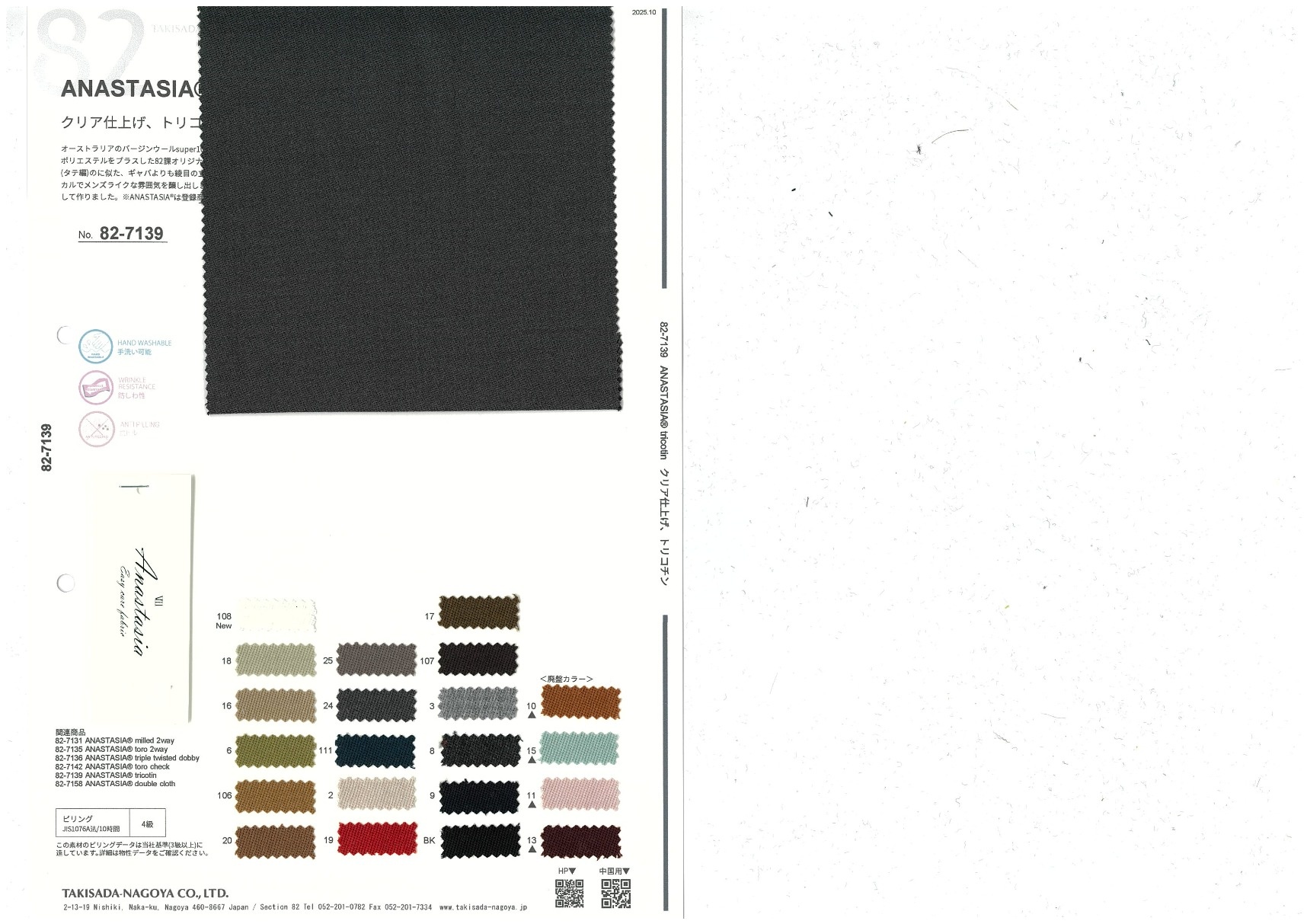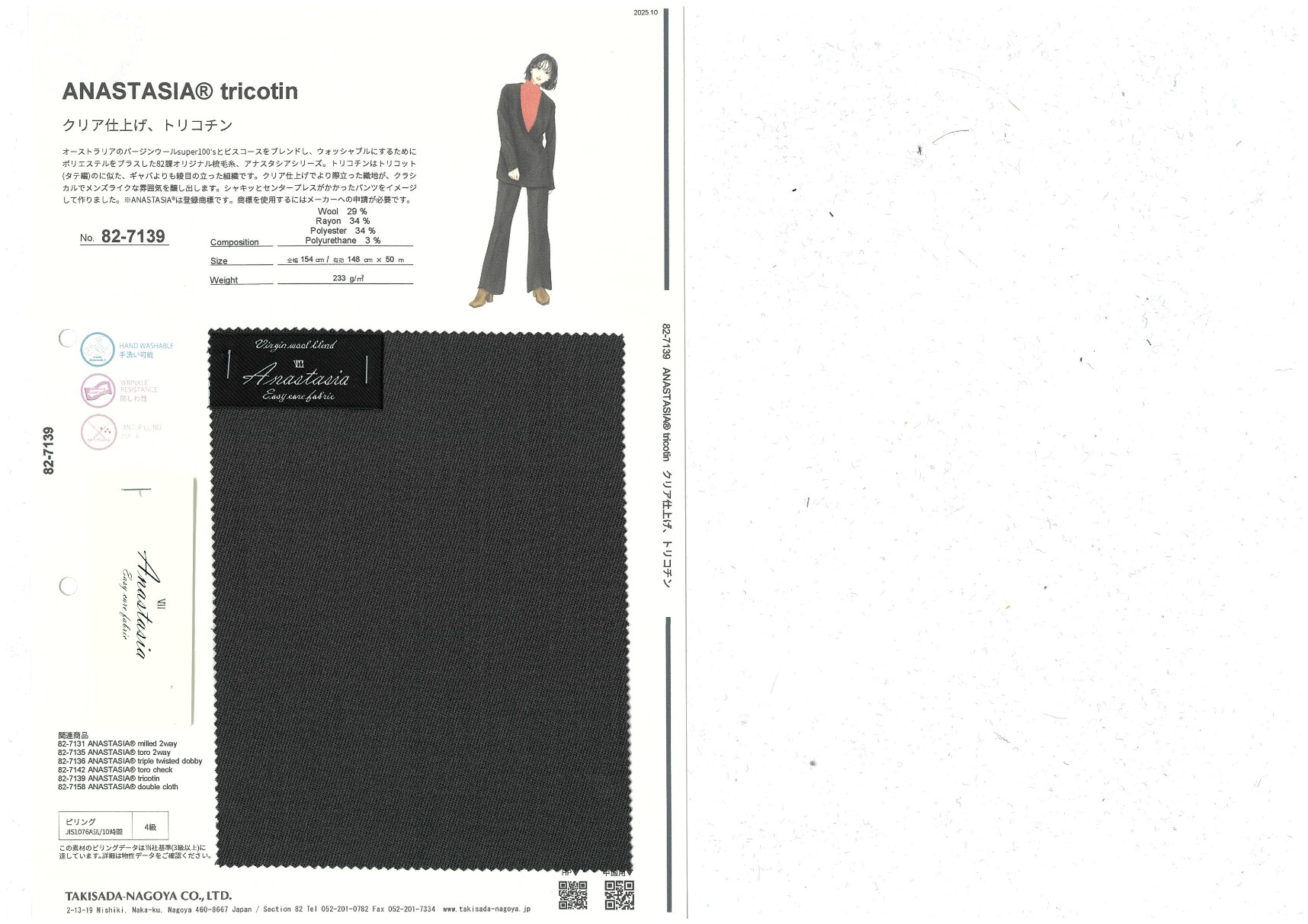 Polyester has been added to the blend of Australian virgin wool and viscose to make the fabric washable. Tricotine has more visible twill lines than gabardine, a feature similar to tricot (warp knitting). The sharper weave achieved by applying the clear finish creates a classic, men's-like atmosphere. This fabric was developed with sharp, center crease pants in mind.