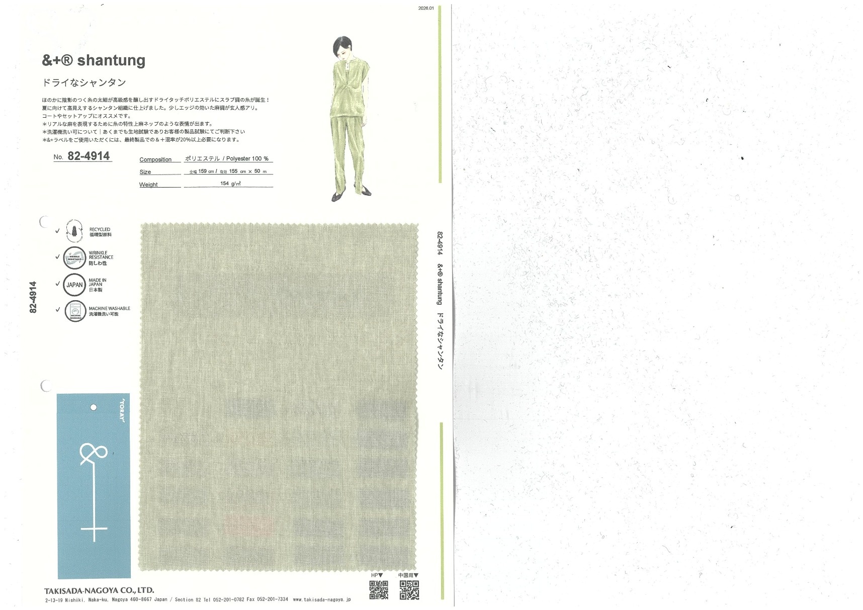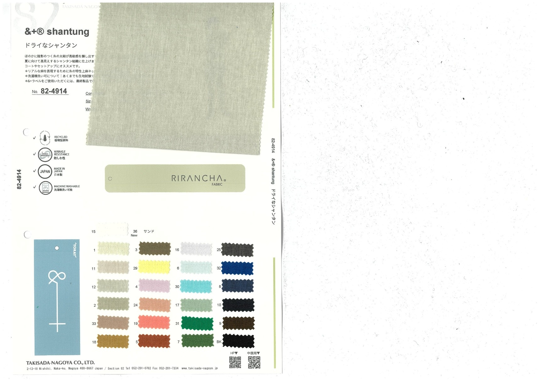 RELA×ION®-Hi shantung Add to Favorites 82-4914 Material/Composition Polyester 100% Specification/Size 155cm x 50m 2026.01 Enlarge Image Enlarge Image of the Color Variations CARE FOR PLANET RECYCLED CARE FOR ANIMAL HAND WASHABLE KEEP WARM COOL TOUCH FAST DRYING UV CUT WRINKLE RESISTANCE 2WAY STRETCH TRANSPARENT PREVENTION WATER REPELLENT MADE IN JAPAN MADE IN ITALY WIND PROOF ANTI BACTERIAL ANTIVIRAL THERMAL ANTISTATIC DEODORANT ANTI PILLING STRETCH HEAT GNERATION